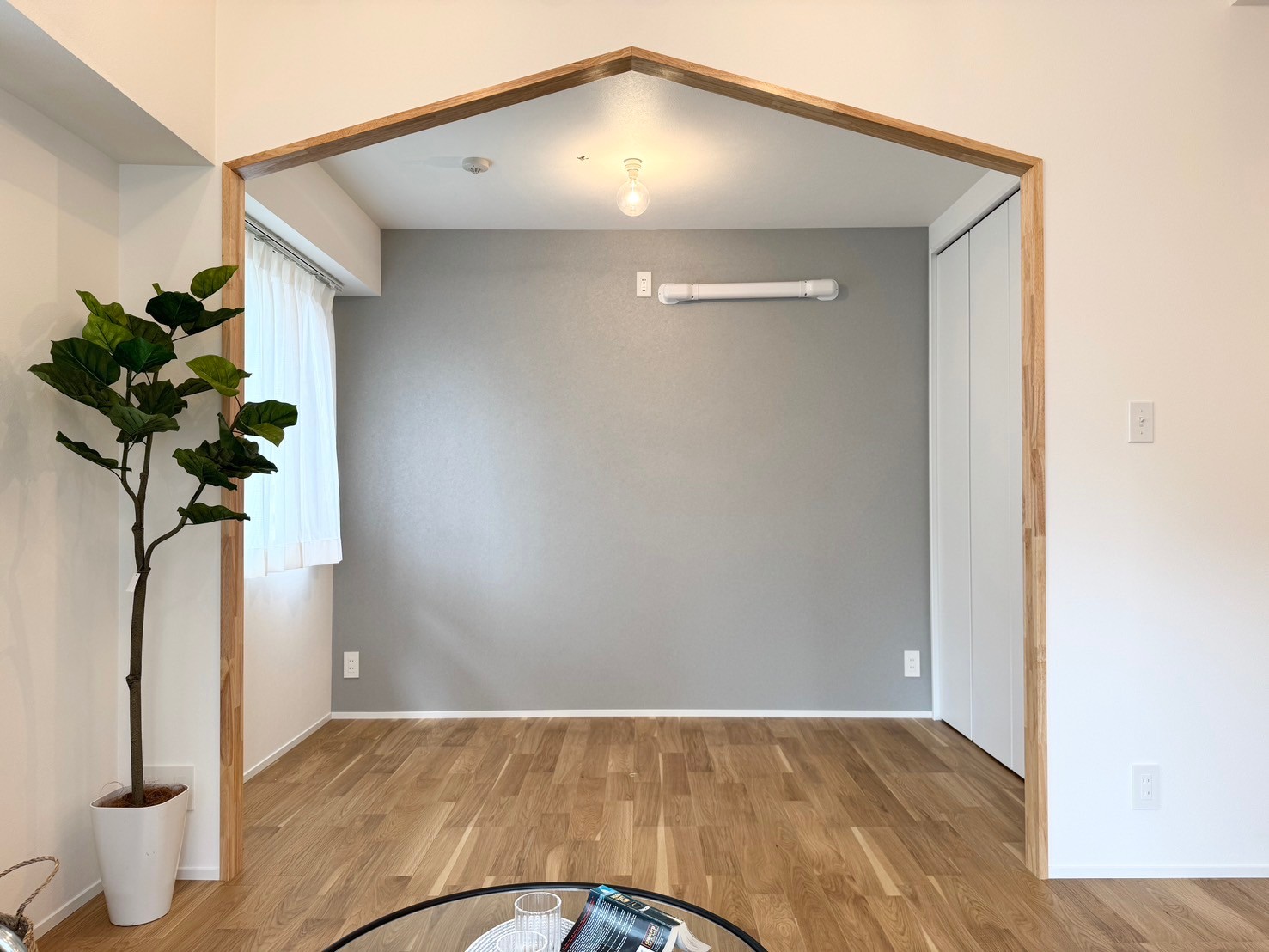 • 隣の洋室は三角屋根のようなデザインを。フルオープンで使うもよし。カーテンレールも設置しているので、お好みのレースカーテンで間仕切りしたり、暮らす前から楽しみなるはずです。