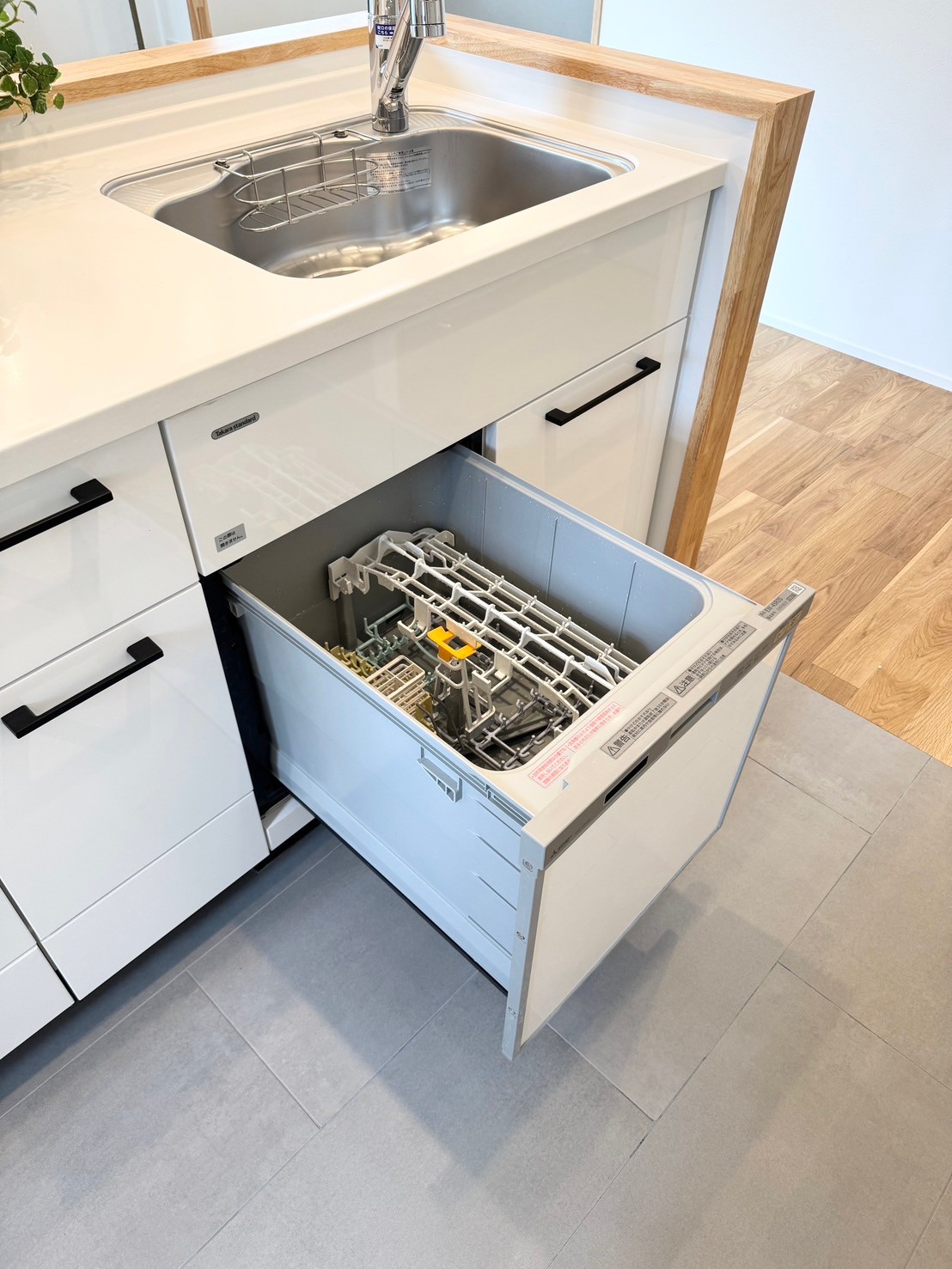 • 食洗機に浄水器と、必要設備が整ったキッチンを設置しました。引き出し収納はソフトに閉まるタイプでストレスフリー。マグネットも付くキッチンパネルで人気の浮かせる収納を。現地でお試しいただけます!