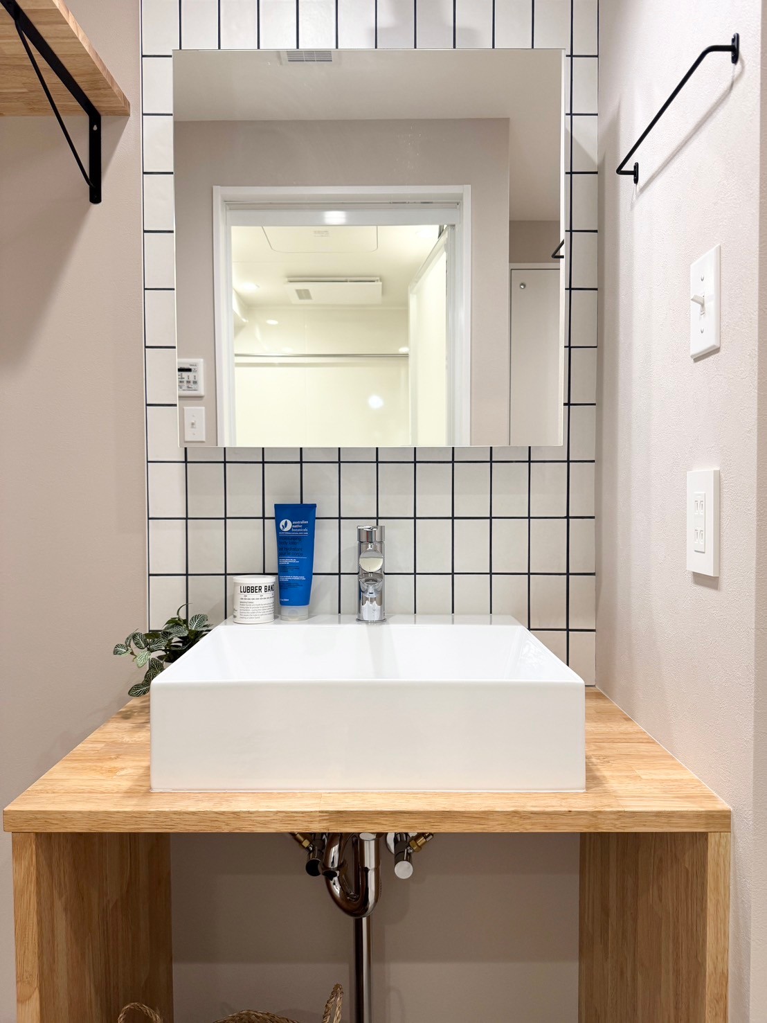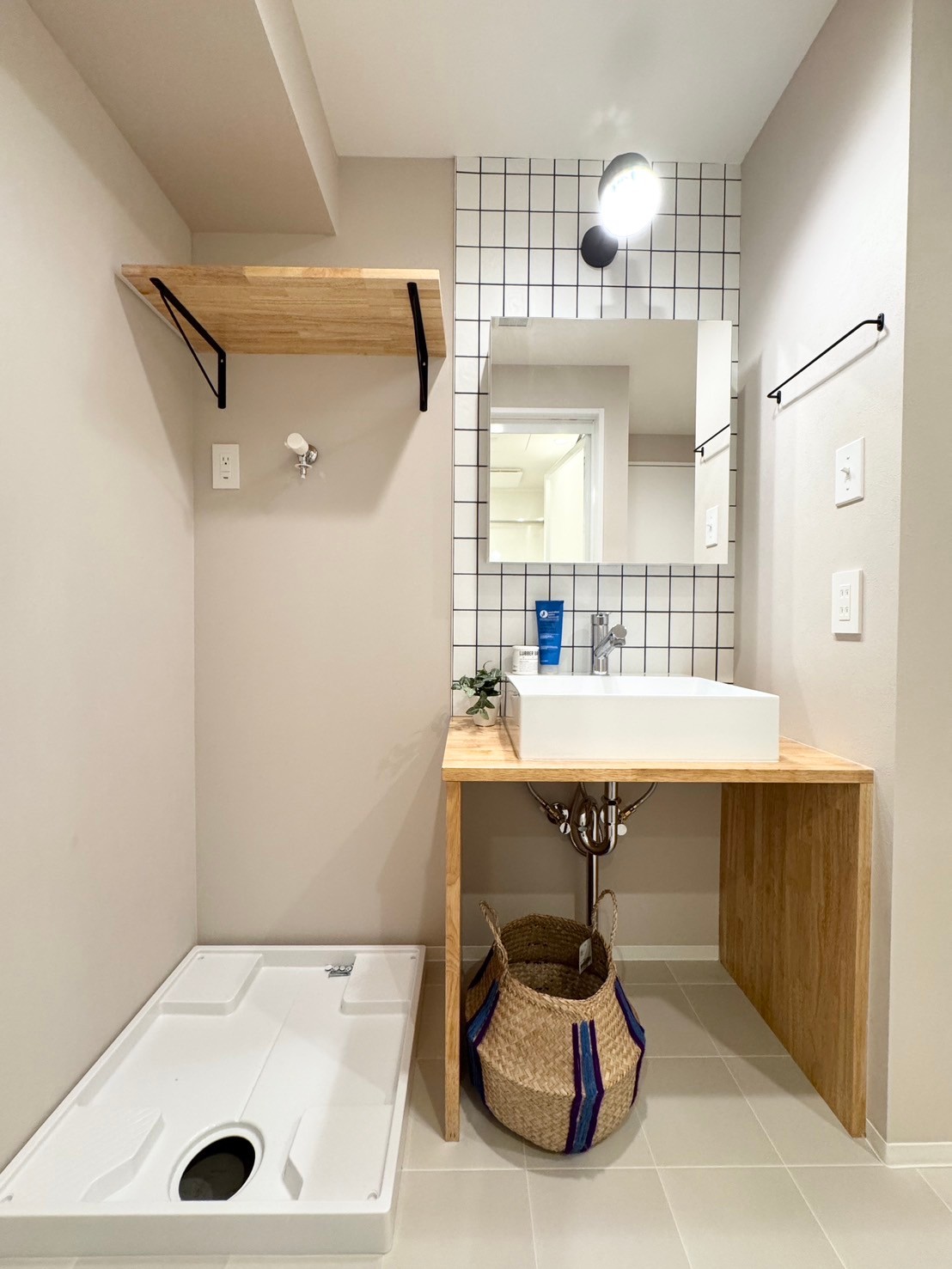 • ホワイトタイルで清潔感を出した造作洗面台。水栓はシャワー付きでお掃除しやすく。カウンター下はオープン収納なので、お好みのカゴやラックを設置するのもありですね!