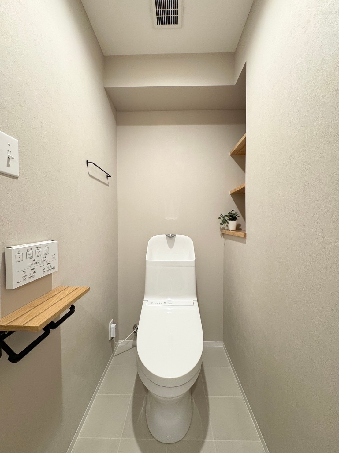 • フチのない便器なので、トイレ掃除の天敵黒ずみが出にくいモデル。右奥には収納棚もあります。ペーパーホルダーも棚付きなので、ポケットに入っているスマホを置いたり、お気に入りを飾ったり。