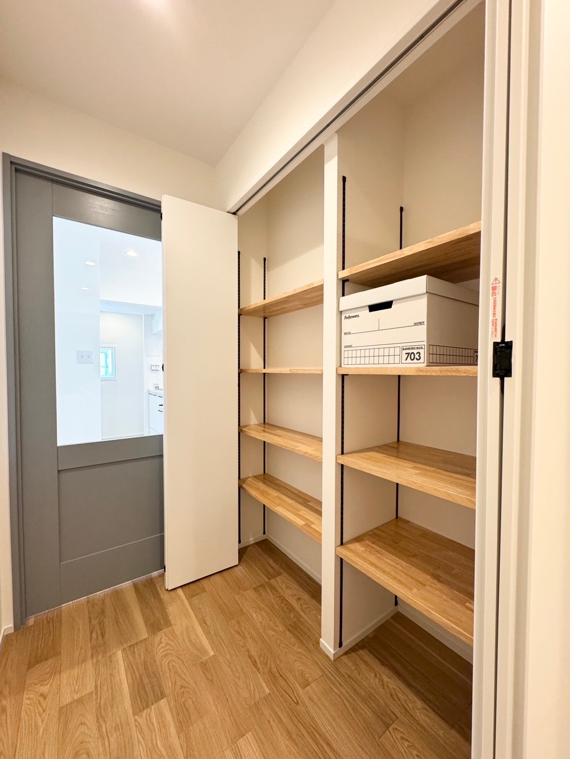 • 絶対忘れちゃいけないのがこの収納。ここは廊下収納。クローゼットには置けない日用雑貨なんかをこちらにどうぞ。棚も高さ調整することができるので、キャリーバックや大きなものも収納できます。