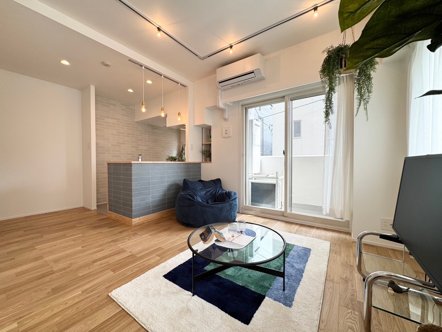 • 入荷が遅れるほど人気の一人掛けソファーを設置!unicoのラグにガラステーブル、テレビラックですっきりみせた家具をセレクト。エアコンも設置済みなのでお引越し準備がちょっとだけラクに。
