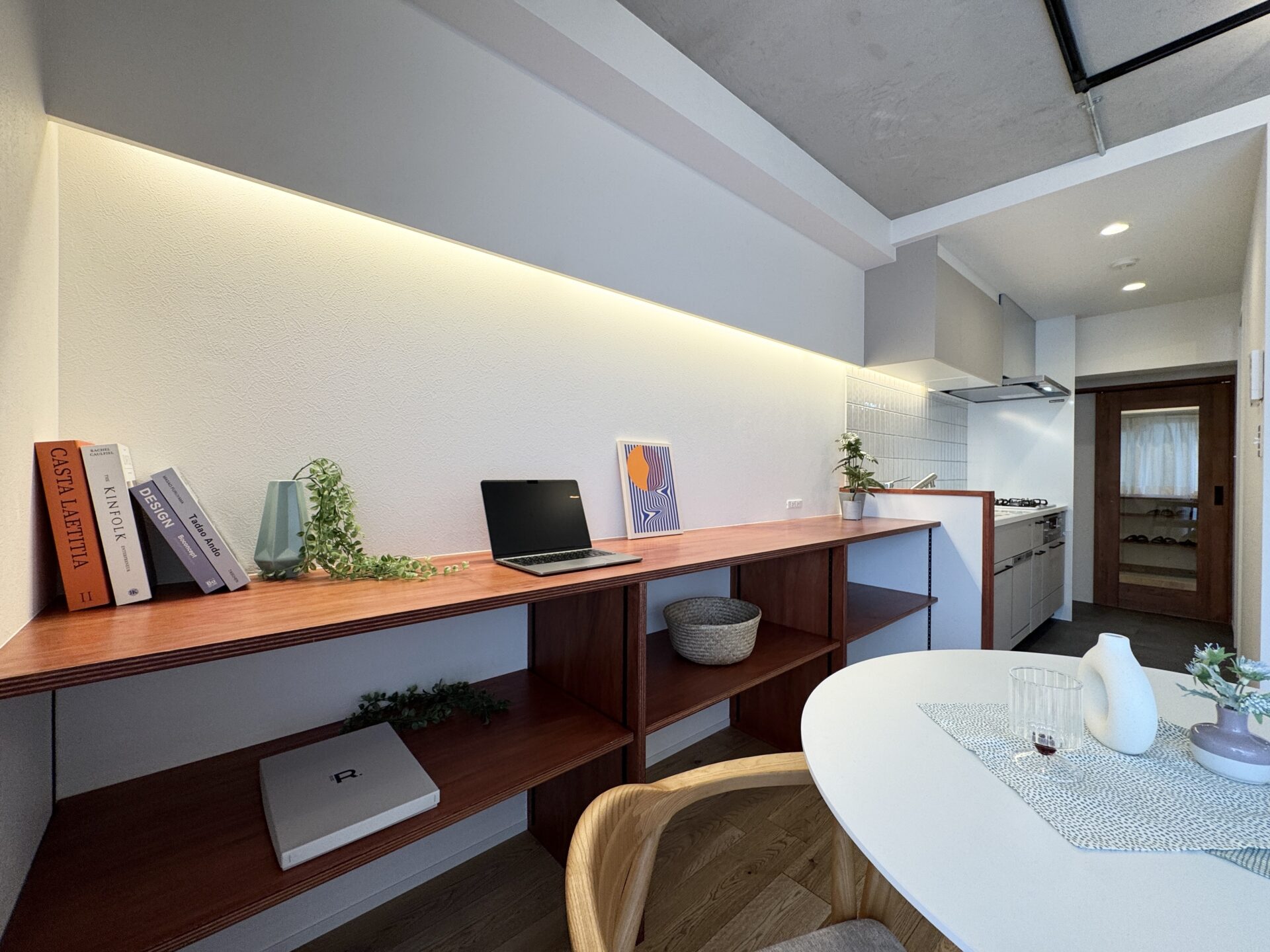• 積層の木材をベースに造作したカウンター兼オープン収納