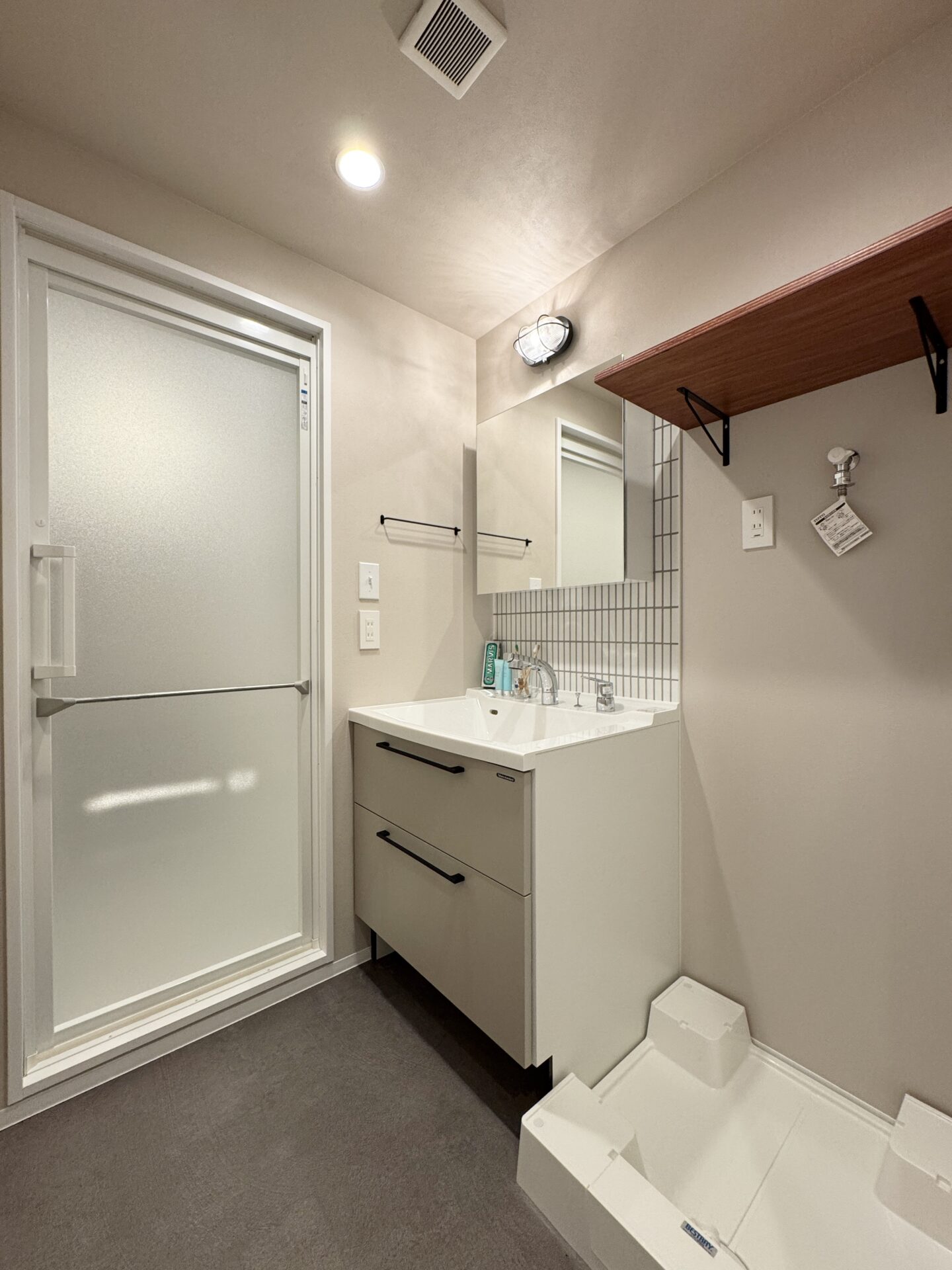 洗濯機置き場の上には棚を設けているので、カゴ収納なんかがおすすめ。