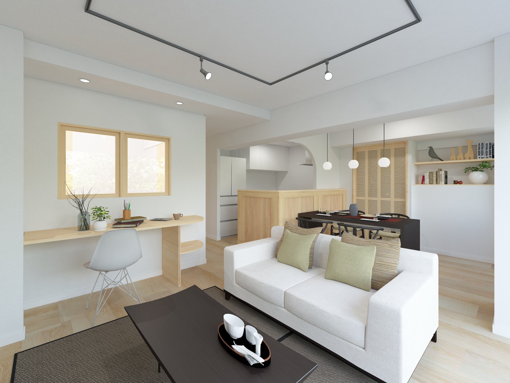 江東区でも人気の高い「住吉駅」最寄りにある、大規模ヴィンテージマンションをリノベーション! 南向きのバルコニーから小名木川ビューの開放的な環境◎ バルコニーに並行したLDKは明るく抜け感のある室内に。 フローリングには突板を採用し、床暖房も完備♪ ワークスペースとして使えるカウンターや、ユーティリティな収納、パントリー、WICなどなど、欲しいものがしっかりある内装に仕上がります。