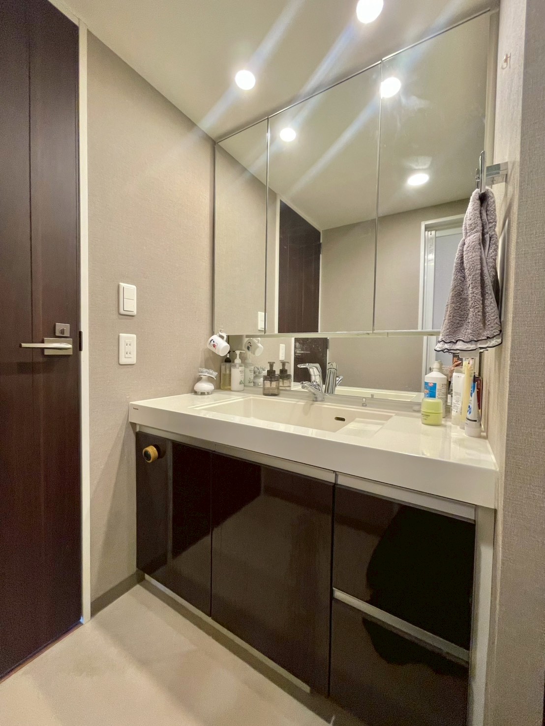キャビネットにもなる三面鏡を備えた独立洗面台