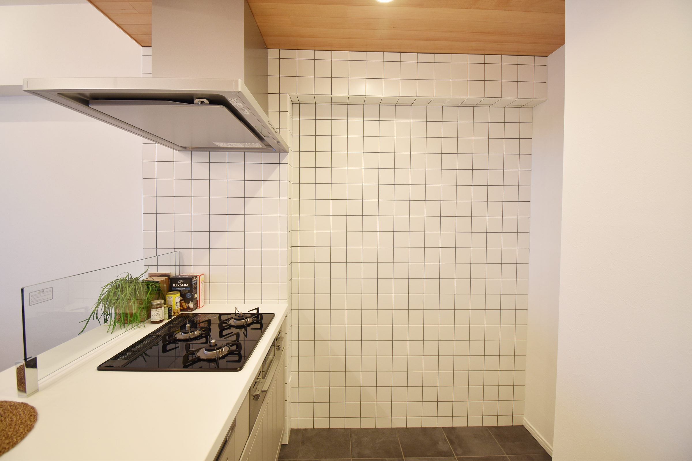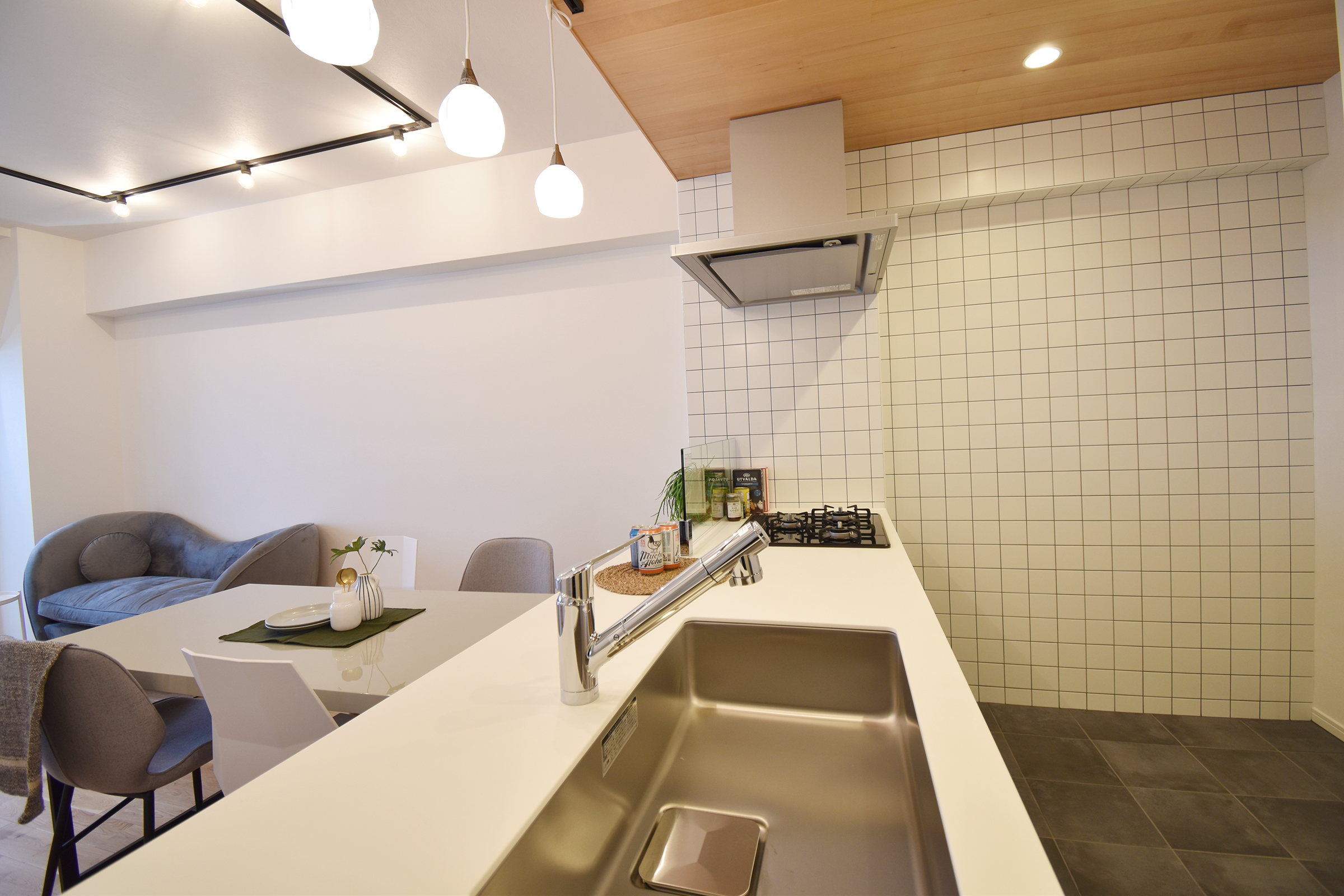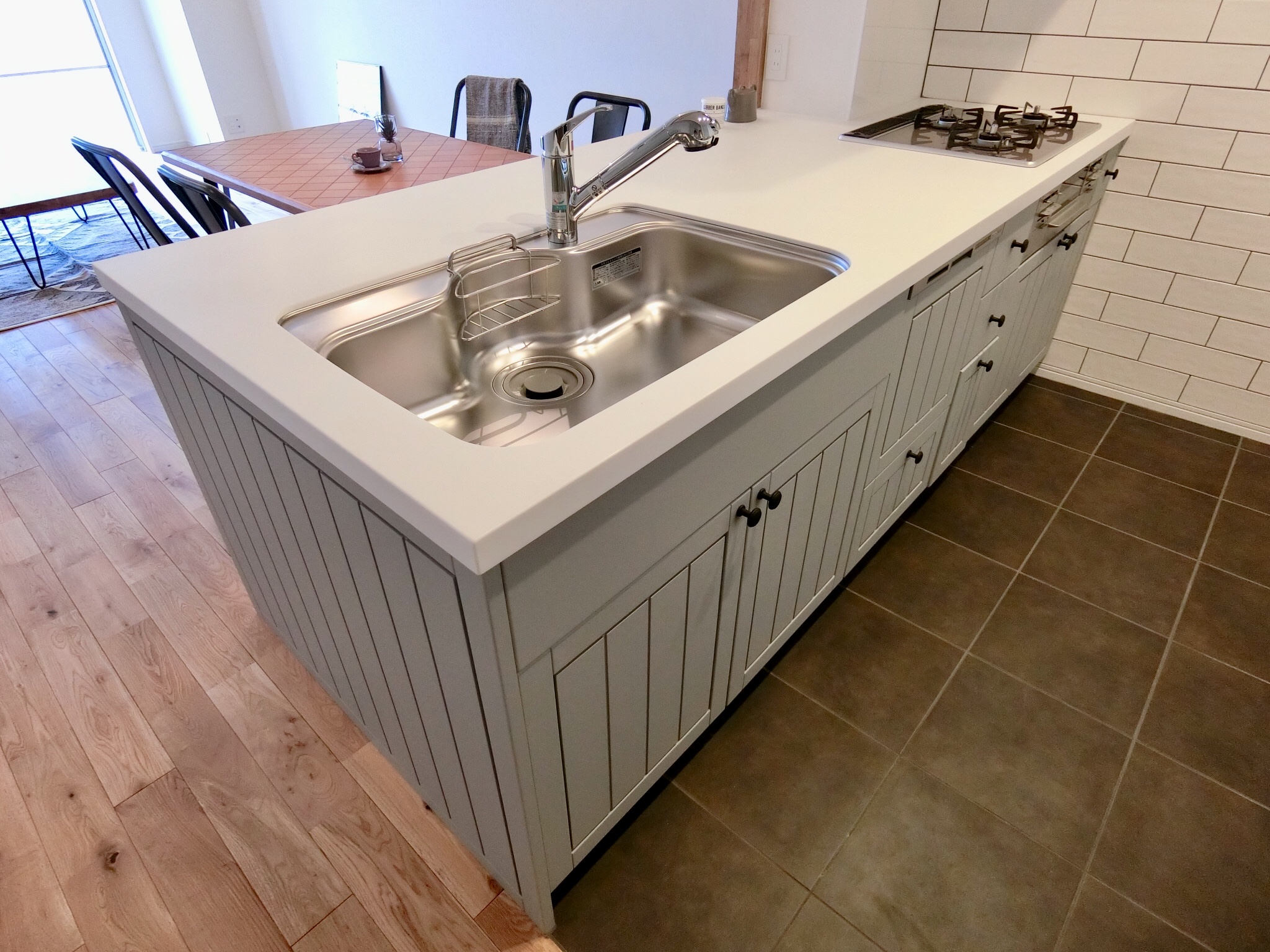 リビングの主役にもなるオリジナルキッチンを採用しました! カラー塗装で仕上げた面材と人工大理石の天板、画像は参考ですが同仕様のものが入る予定になっています。