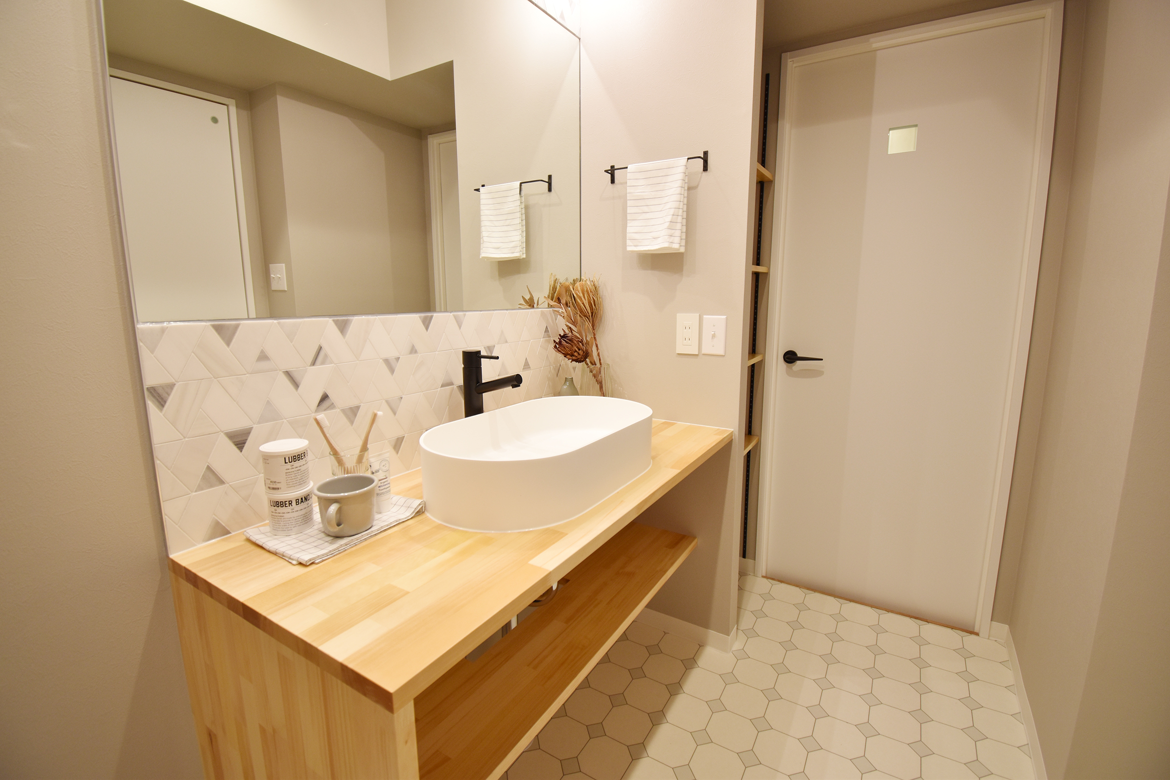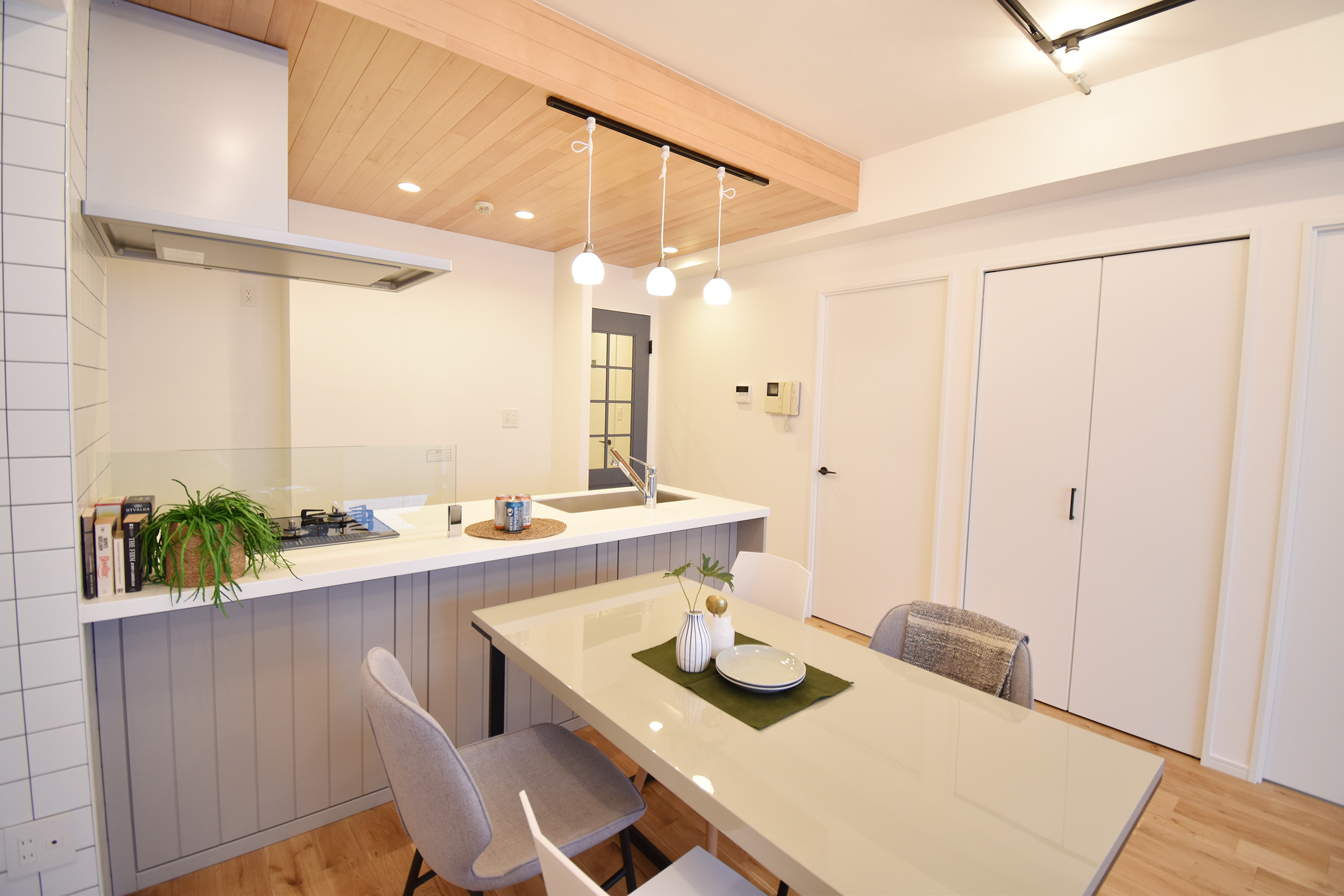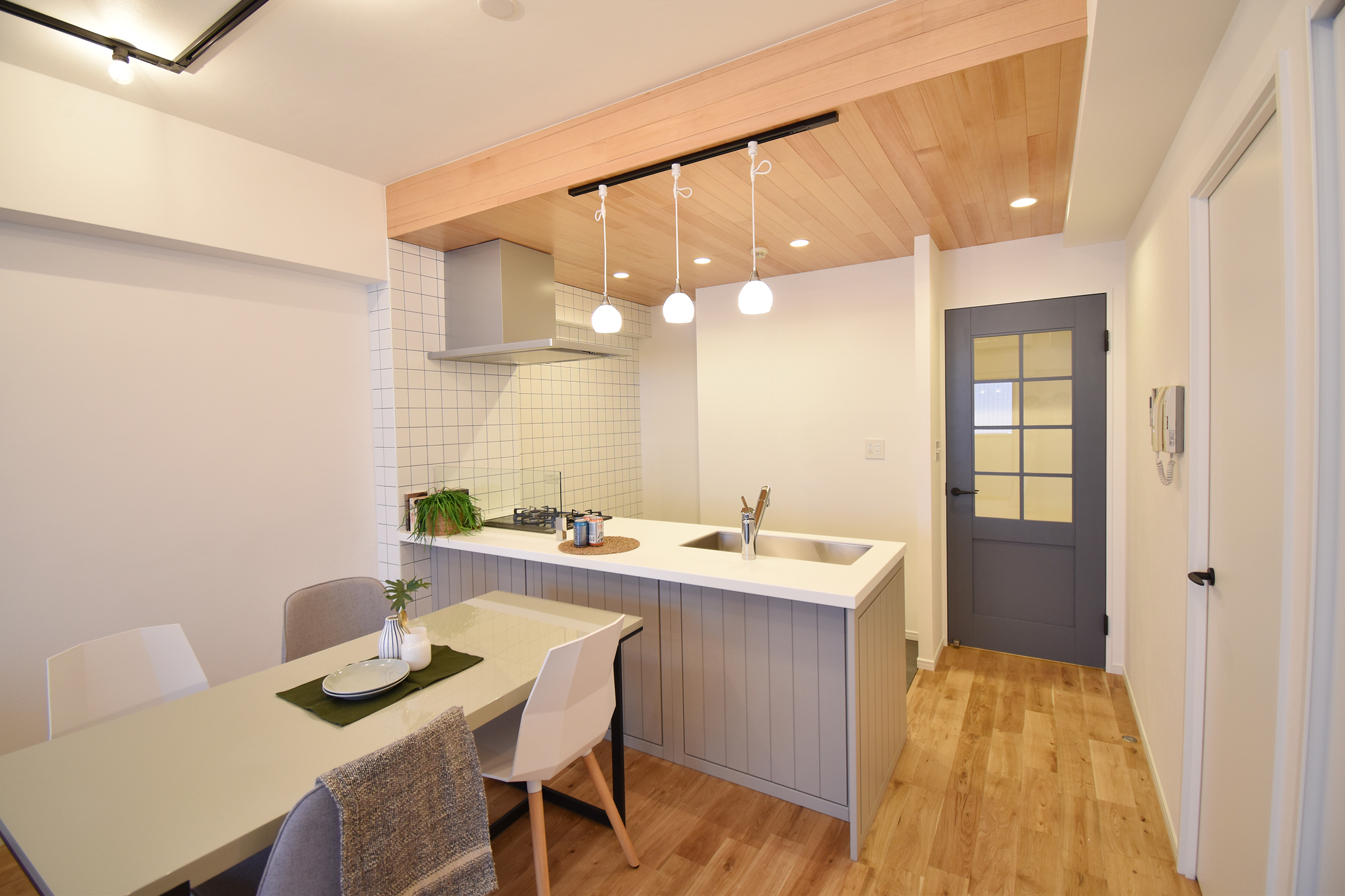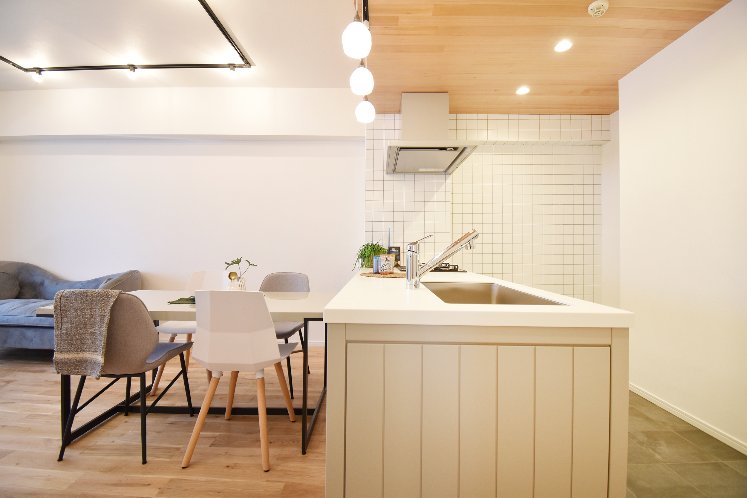 リビングの主役にもなるオリジナルキッチンを採用しました! カラー塗装で仕上げた面材と人工大理石の天板、画像は参考ですが同仕様のものが入る予定になっています。