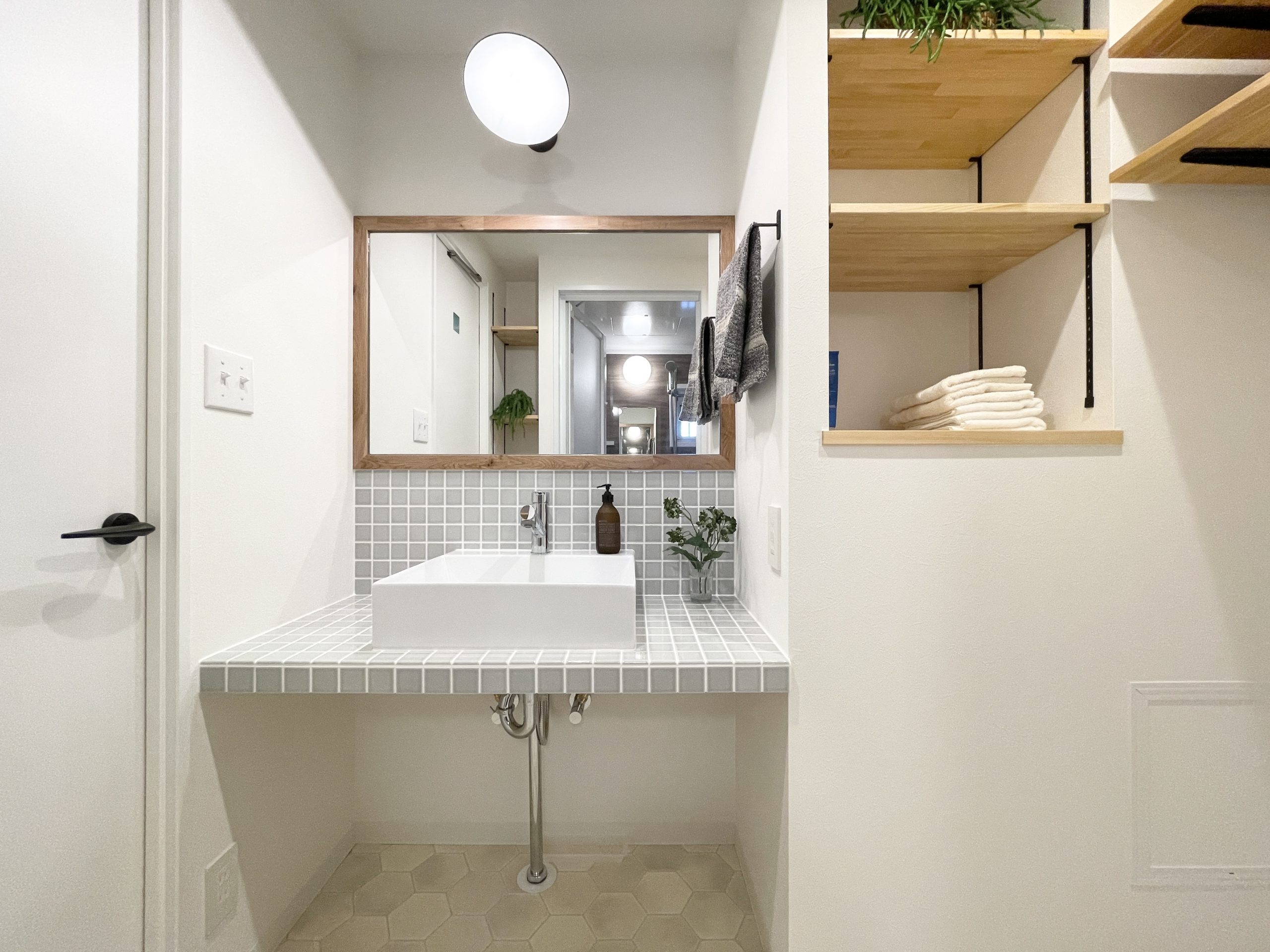 • タイルの洗面化粧台にはオリジナルの大きな鏡がアクセントに!