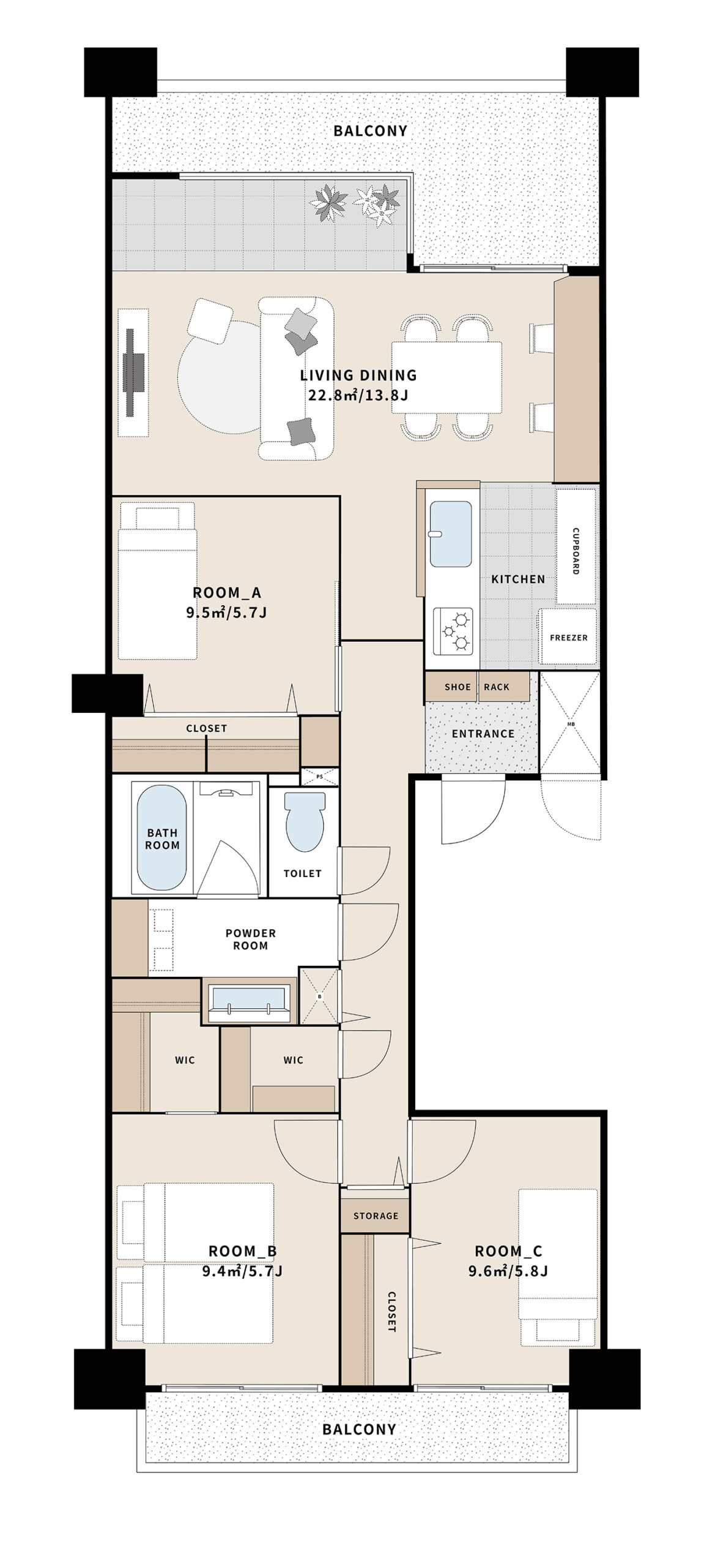 • 3LDK+2WIC+2バルコニー+インナーバルコニー+DEN