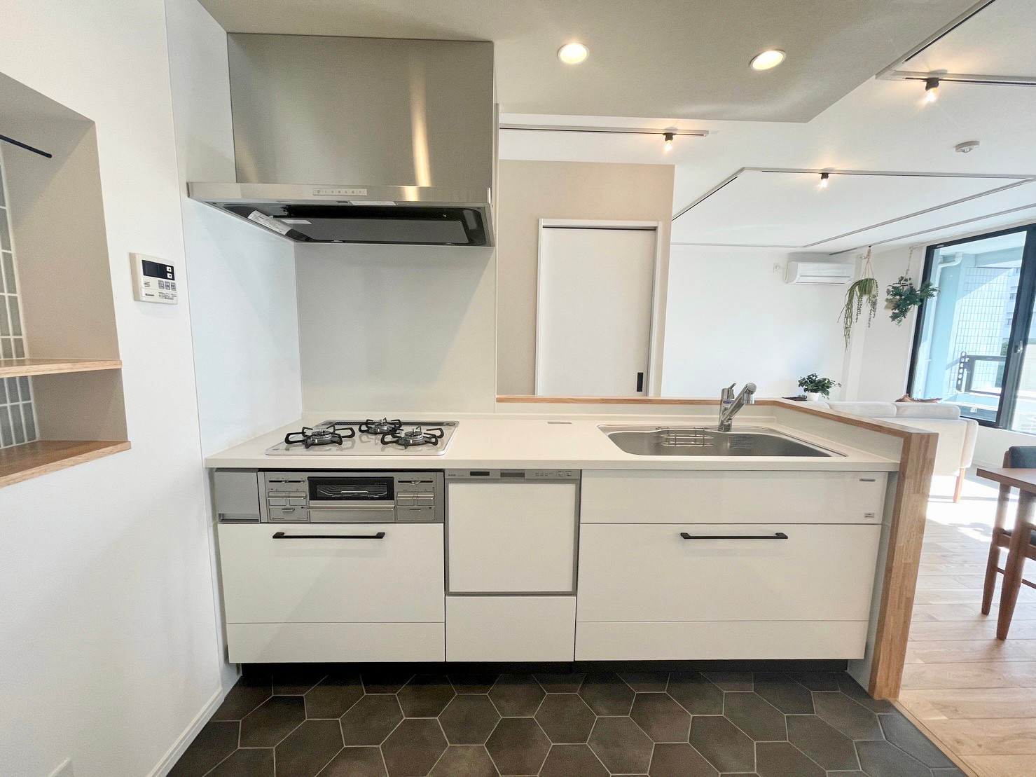 • キッチンは対面式にリノベーション。床材には磁器タイルを施工し、キッチンとLDを色や材質で分けるデザインで施工しています。