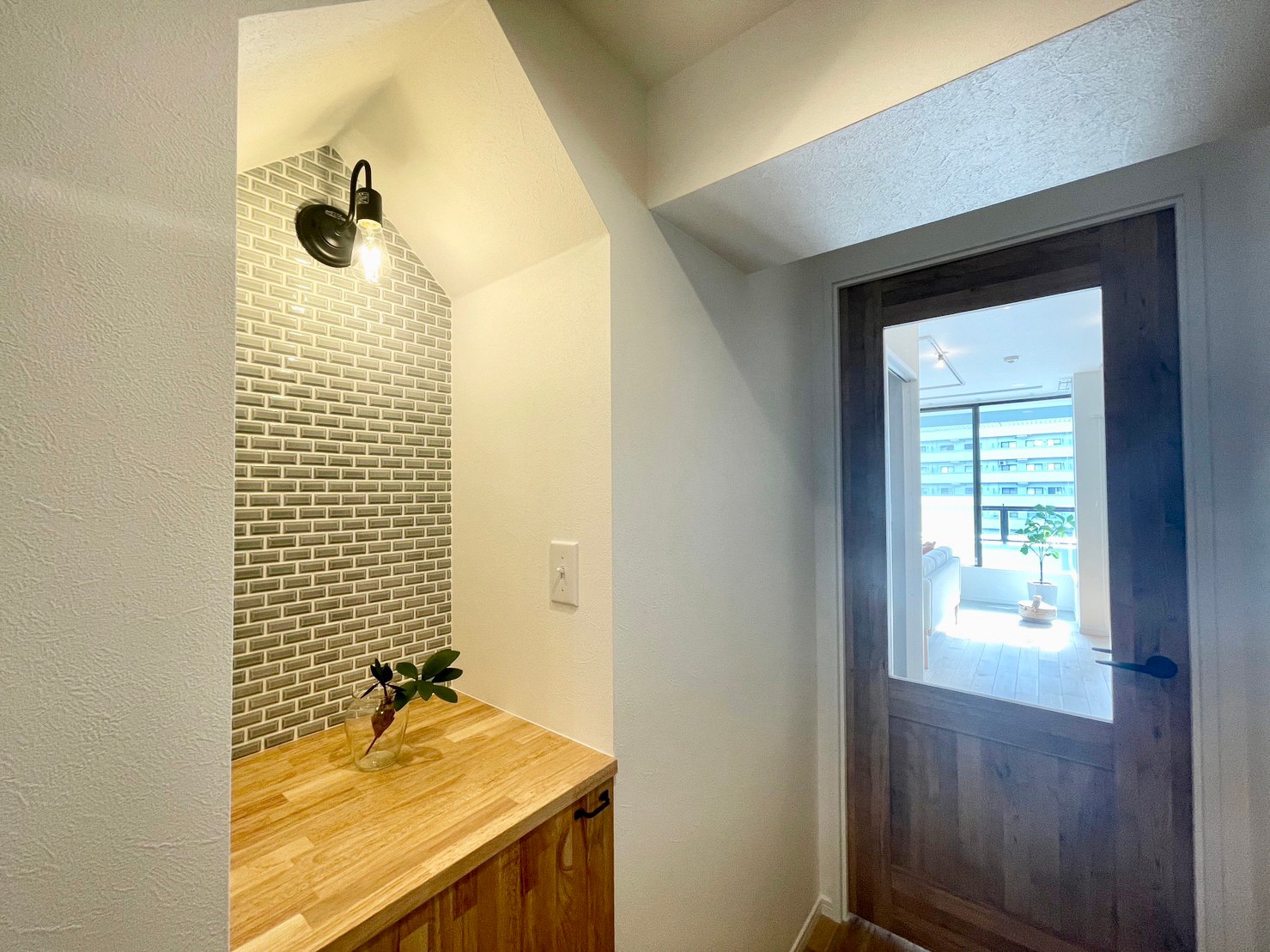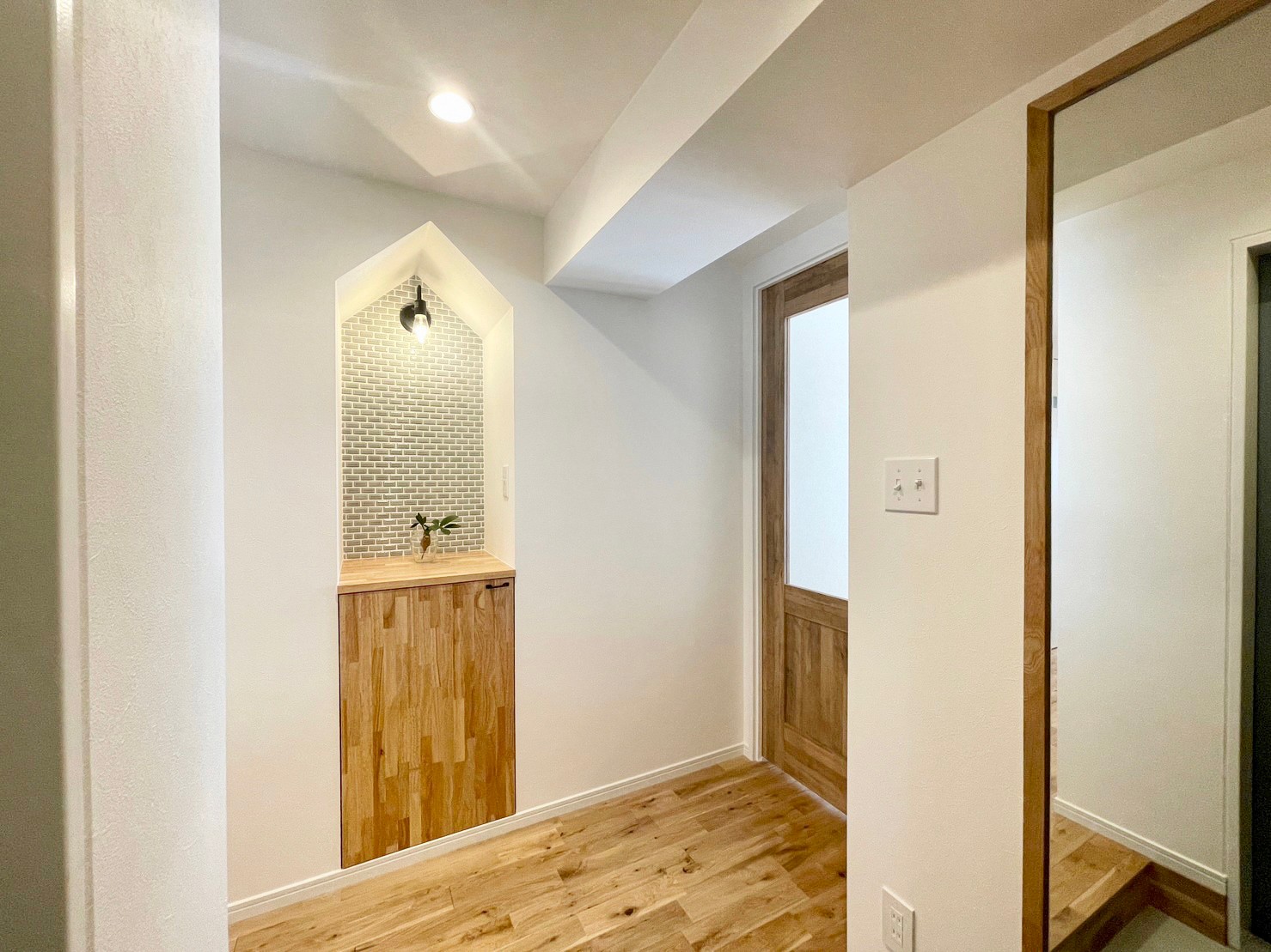 • 玄関を開けて一番初めに迎えてくれるのは三角ニッチ。鍵を置いたり、写真を飾ったりできる小さなスペースです。カウンター下には開戸付きの棚がついています。