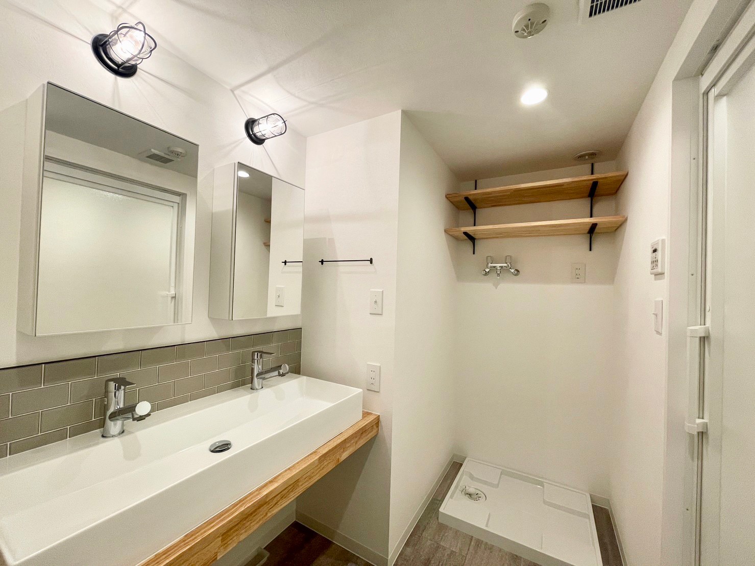 • 洗面化粧台は二人並んでも十分な広さを確保!水栓も2つ、ミラーキャビも2つ、マリンランプも2つ、朝の渋滞は解消できそうです。