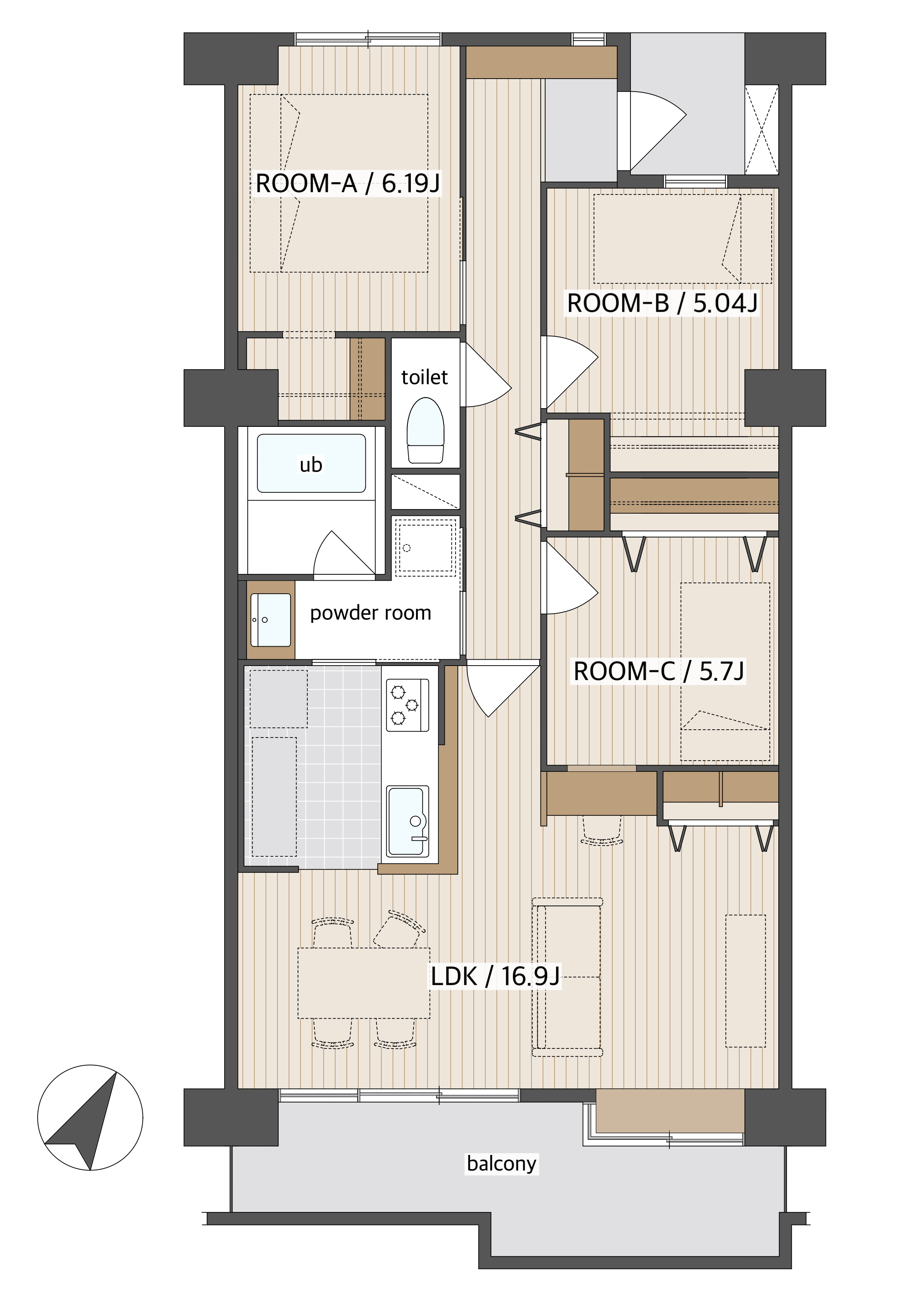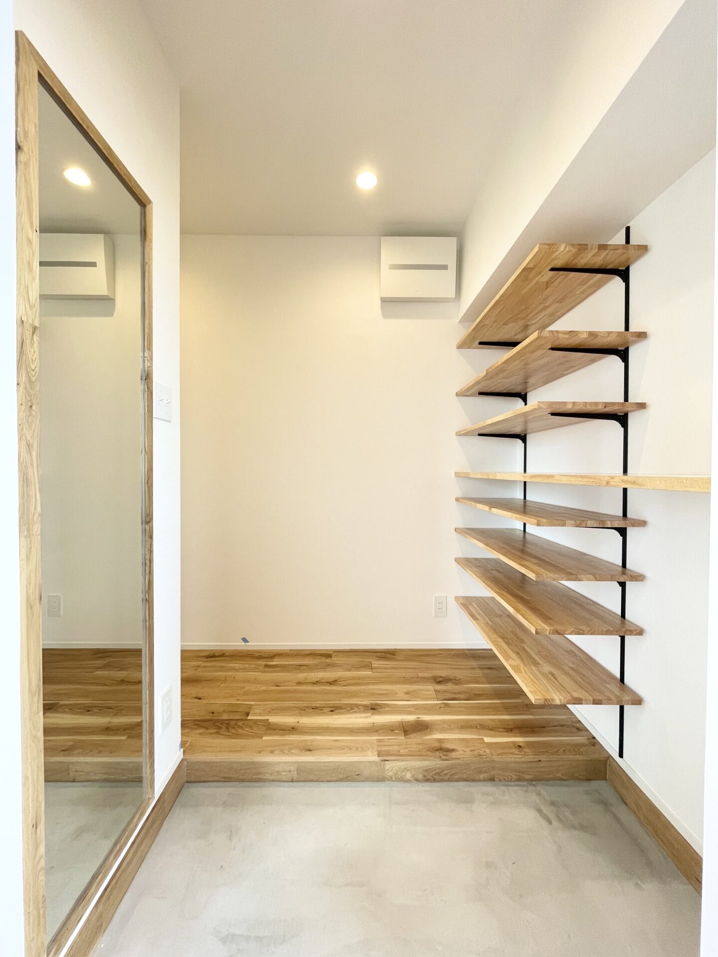 • 土間スぺ―スを広めに確保しました。右には靴棚とカウンタースぺ-ス。鍵やアクセサリーを置くスペースにも♪ベビーカーなども広げたまま置いておくことが可能です。