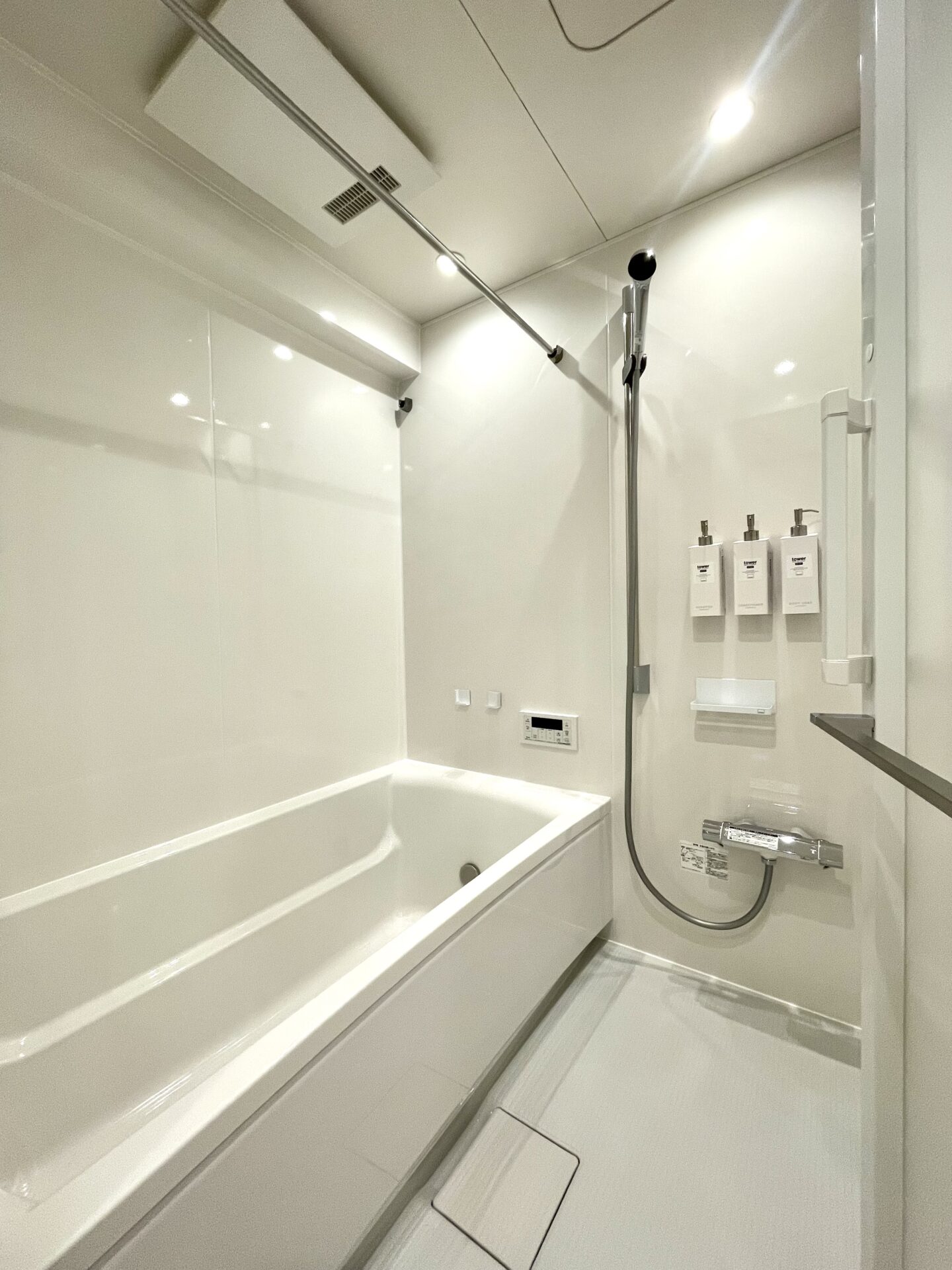 • ホワイトでカラー統一したお風呂です。壁のパネルは【ホーローパネル】を使用!水垢・石鹸汚れもシャワーをかければ大丈夫☆お掃除しやすい仕様です。