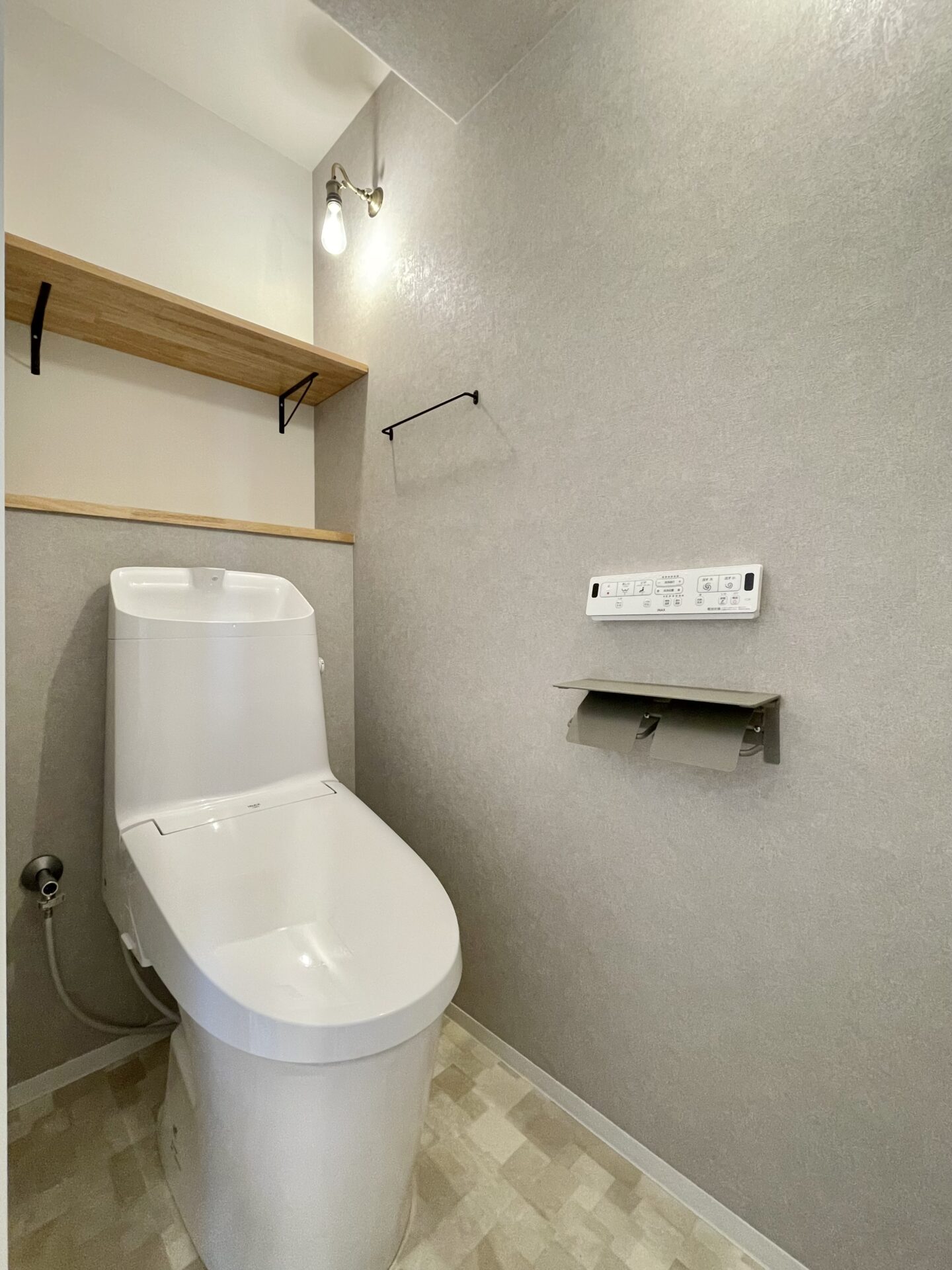 • 手洗い付き。グレーとブラックのアクセント×アンティーク照明。トイレでも気を抜かないオシャレ空間です。