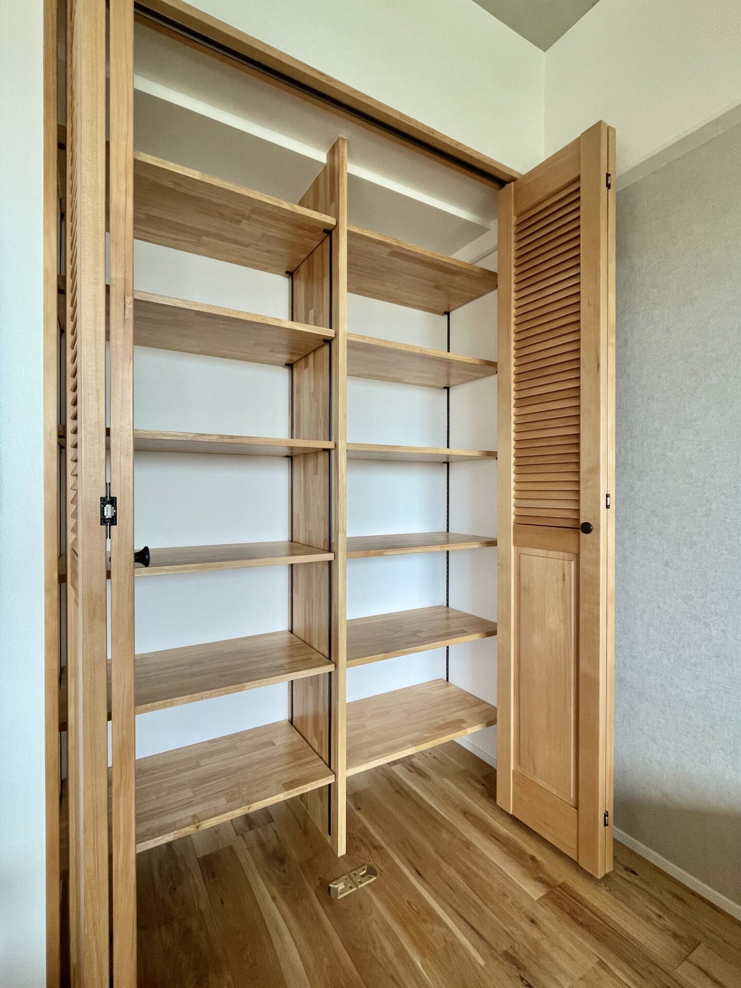 • ごちゃつきがちなリビングには、棚板たくさんの、詰込み収納を設置!木製折れ戸はお部屋のアクセントにも♪