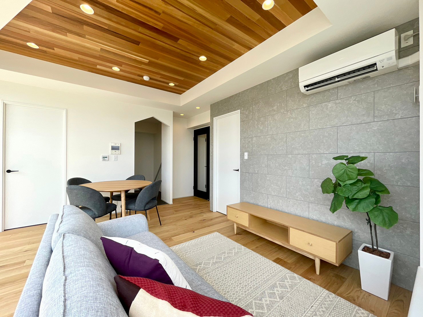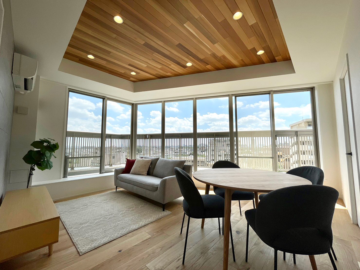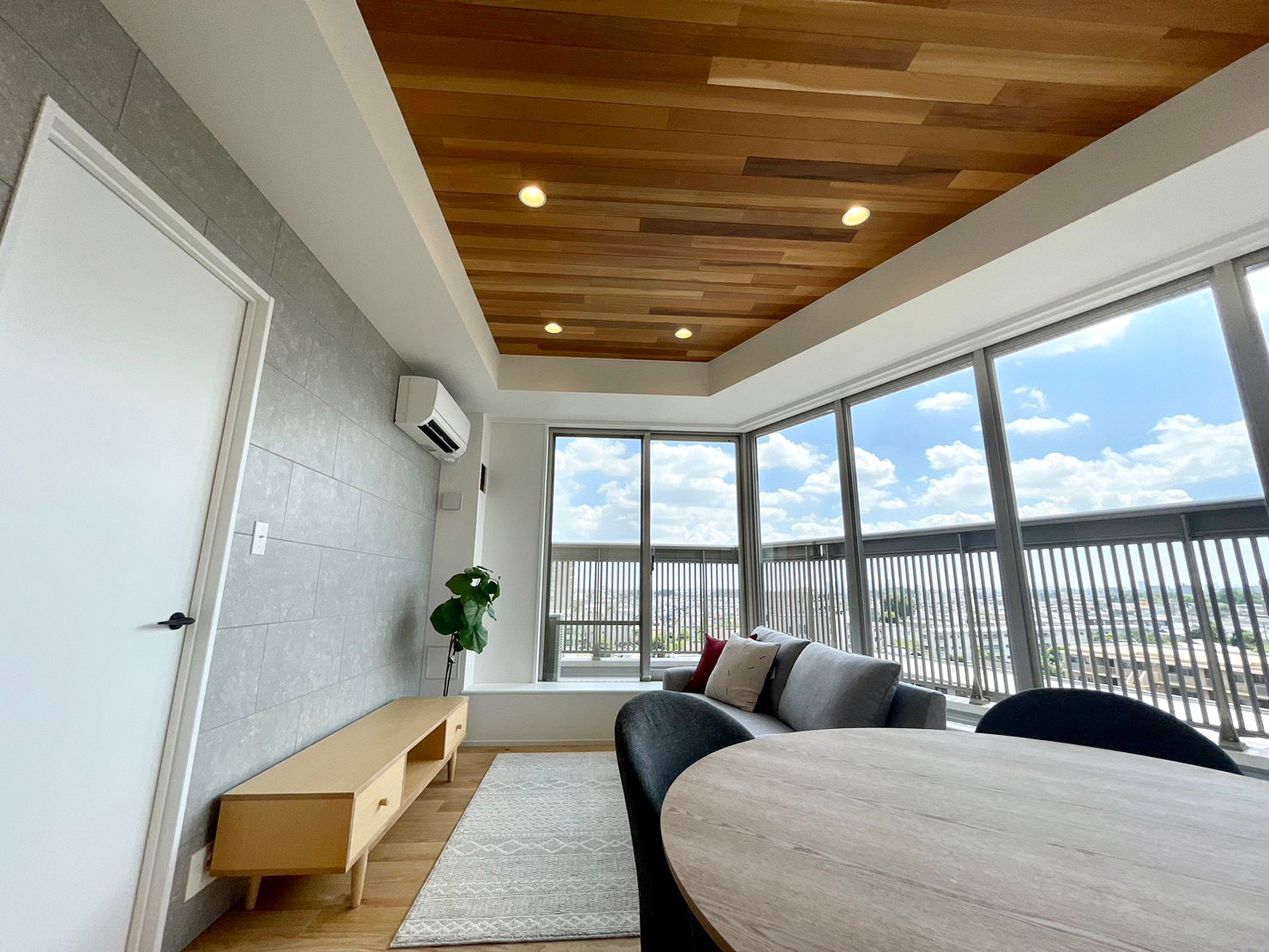 • 天井には天然木材を使用し、ラグジュアリー空間を演出しています。