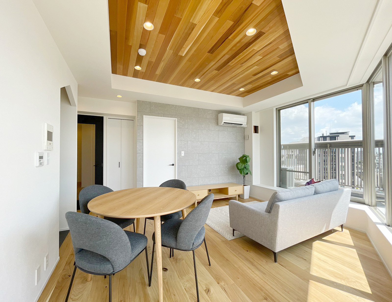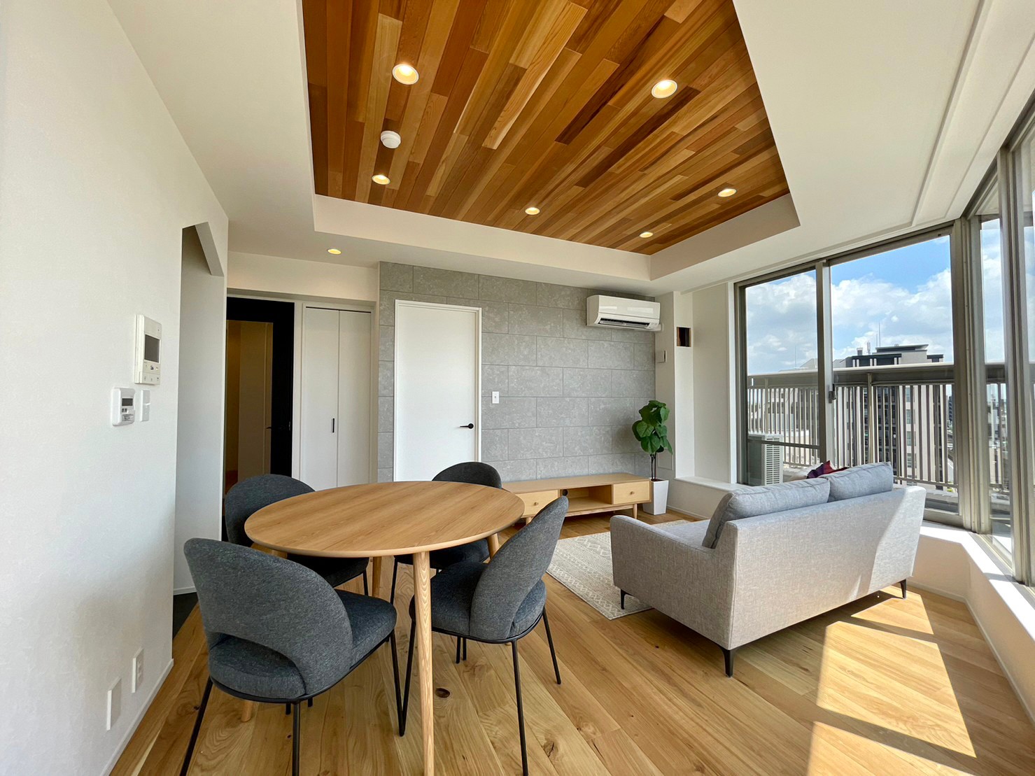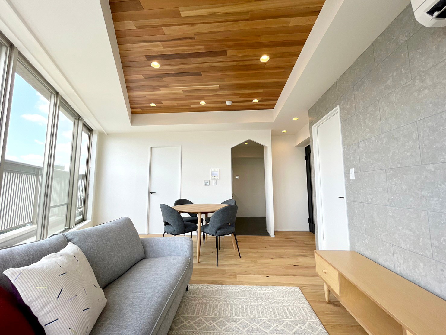 • 天井には天然木材を使用し、ラグジュアリー空間を演出しています。
