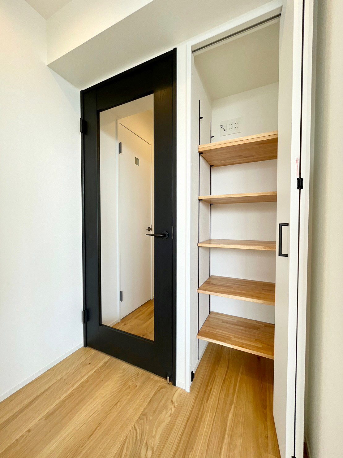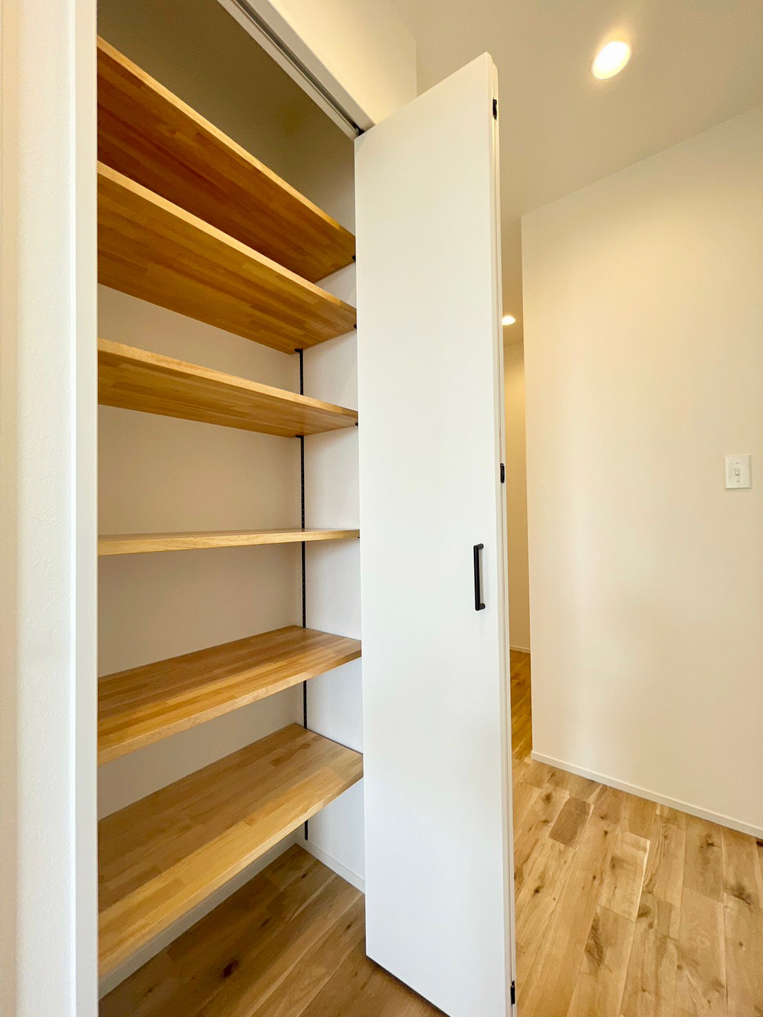 • こちらは廊下収納。棚板は可動できるので、収納するものによって自由に高さ調整していただけます。