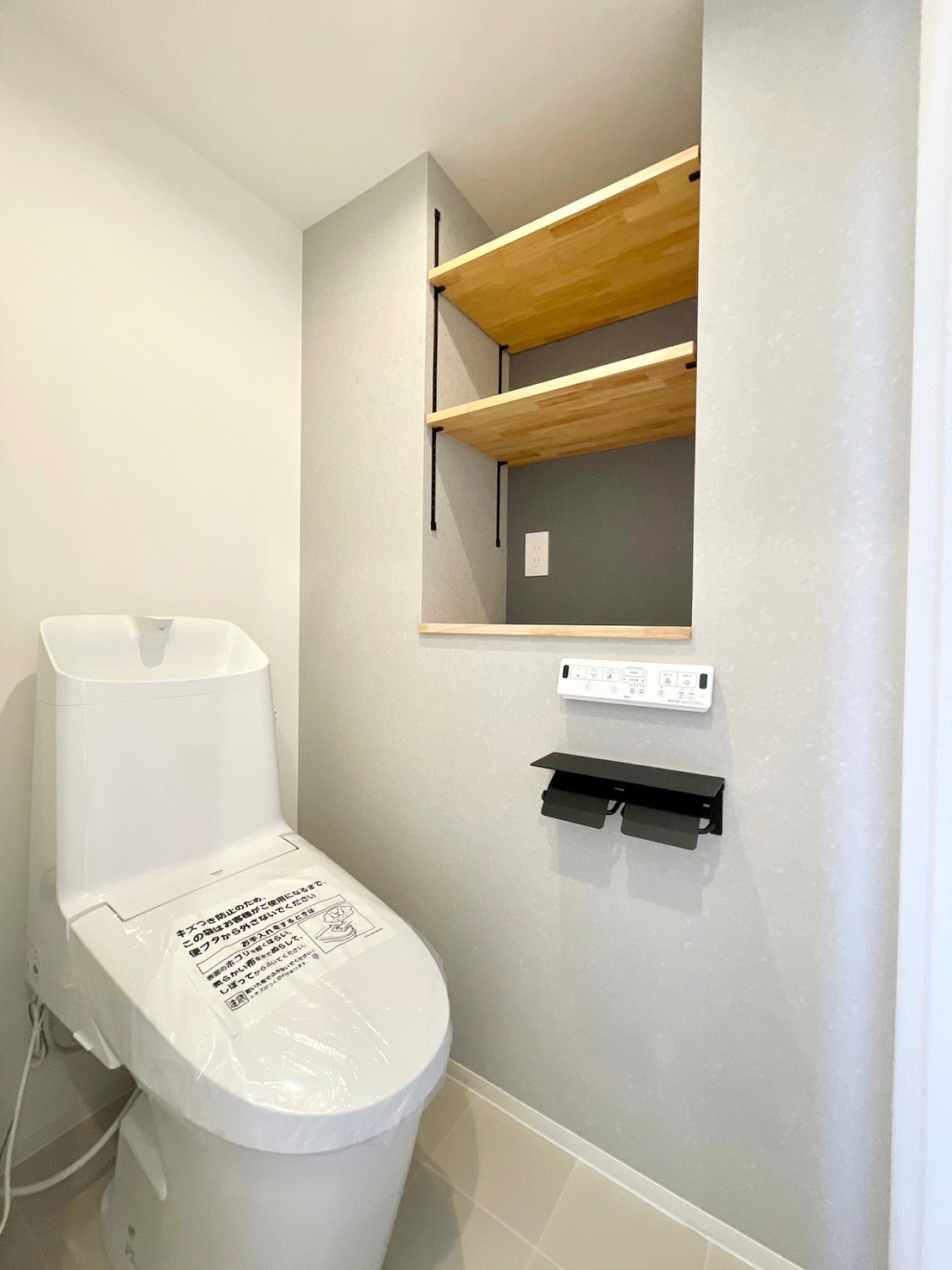 • 可動棚つきのトイレエリア。トイレはTOTO社製。お掃除しやすいフチレスのモデルを設置。紙巻ホルダーはアクセントになっているアイアンブラックのものを。棚もついているので、ポケットのスマホも置けます。