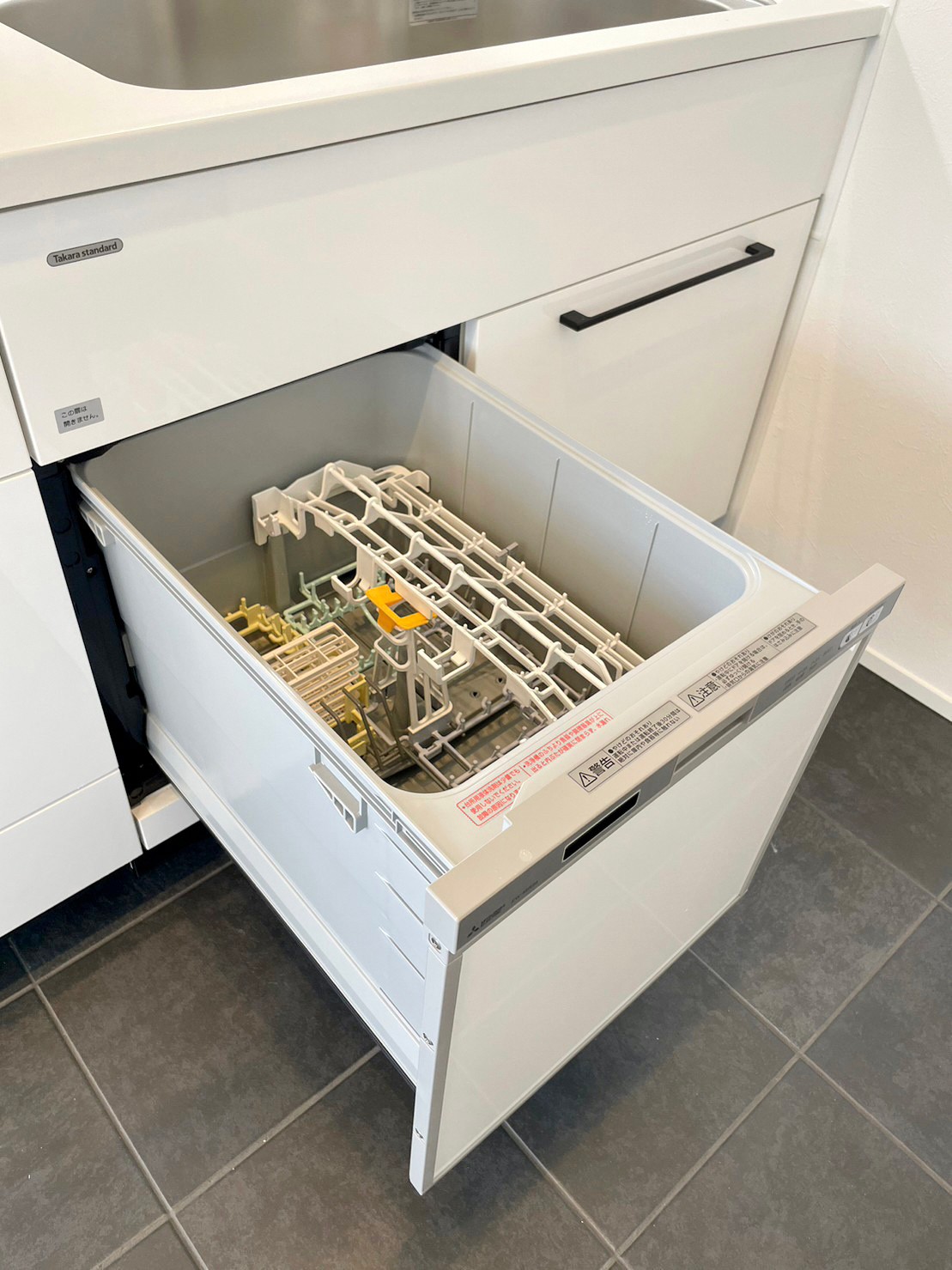 • 水垂れを少なくするように、シンク下に食洗機を設置しています。生活してみるとわかる、実用性抜群な配置になっています。