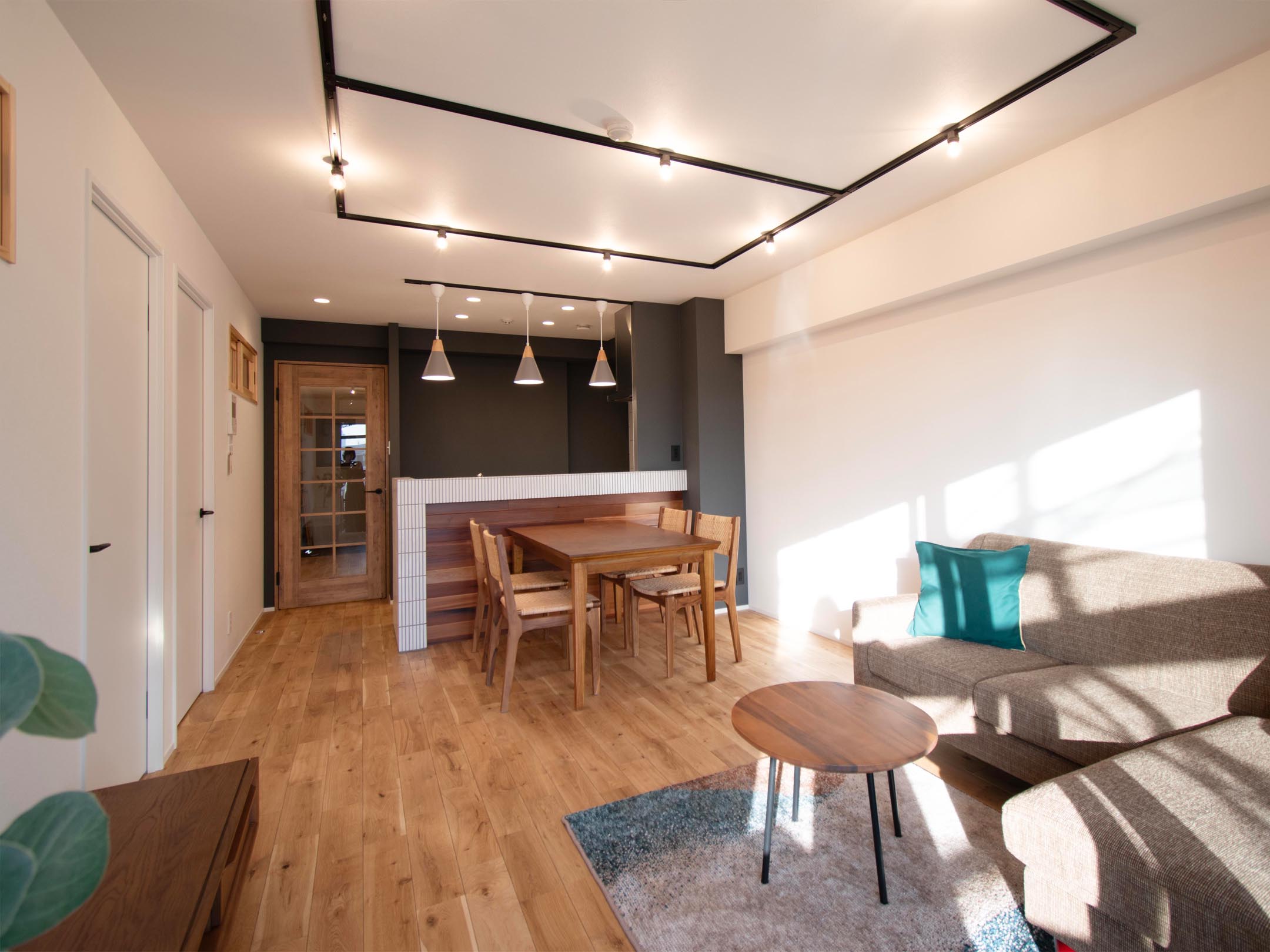 トーンを合わせたキッチンの腰壁で雰囲気UP。