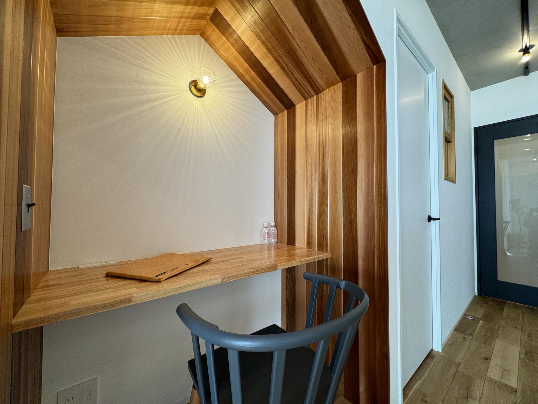 内装 相性抜群 無垢フローリング×モルタルが最強です。 リビングは天高が命。 天井を作らないことで再現できる空間。 座面の統一。 モルタルより少し重めなカラーがおすすめ。 白壁だからできること。 テレビも良し。プロジェクター投映だってお任せあれな、クロス。 「夜はきっと・・・」想像できる。 日中はレッドシダーの質感を感じ、夜はライティングで愉しむ。 隠さない努力。 換気ダクトも演出のひとつ。 小さな気遣い。 その小さな室内窓が、洋室の圧迫感を大きく軽減してくれることは知っていて欲しい。 座れば異空間。“超集中” リビング横なのに“超集中”が可能になることは座ってからのお楽しみ。