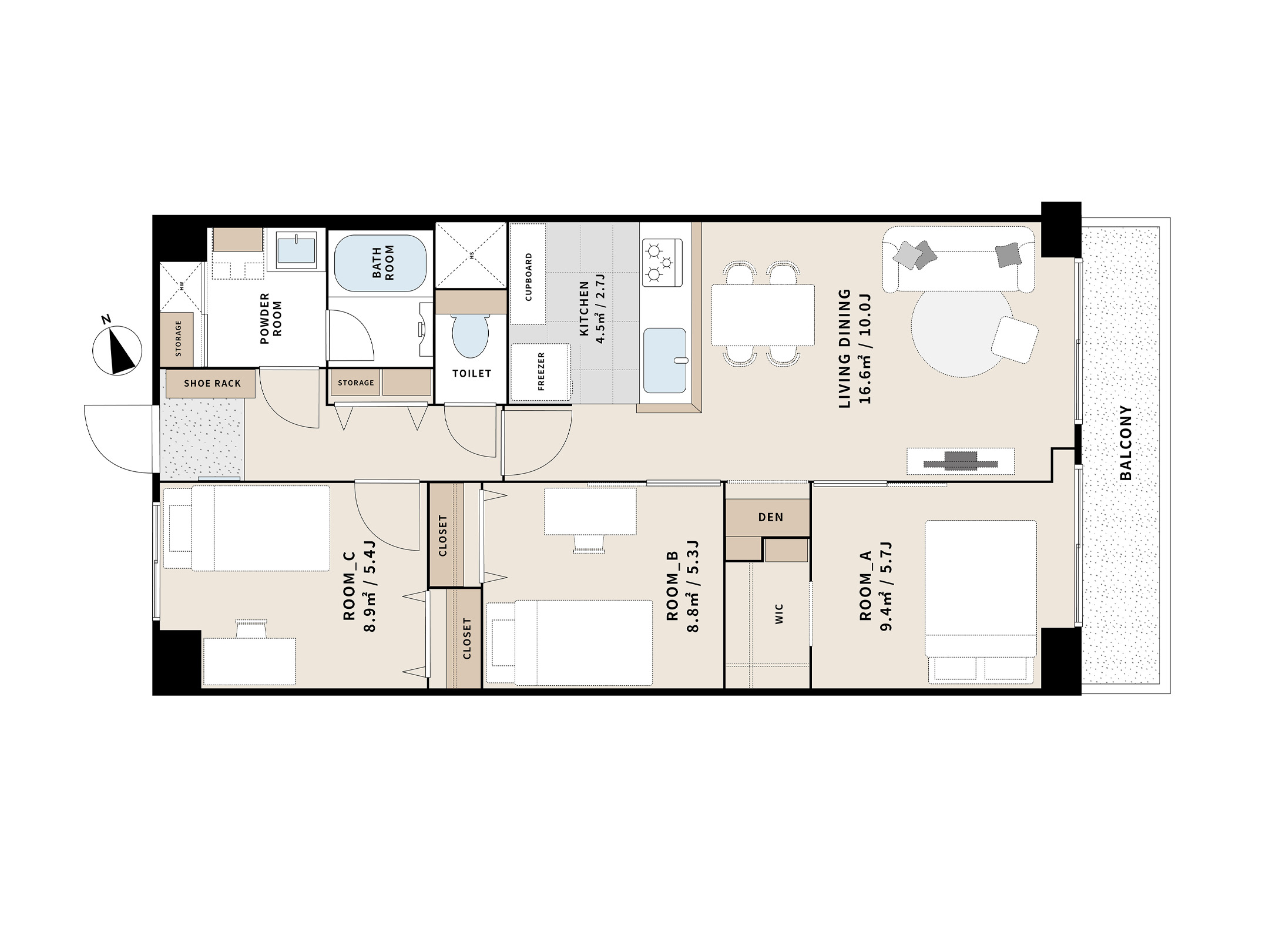 内装 ダークカラーの木材 可愛い色味の木材だけではなく、大人なカラーを取り入れるとぐっと印象が変わります。 家具との調合 ダークカラーはお部屋の印象が重くなりがちなので、家具の形で空間を作ります。 プチ書斎 ちょこっと作業、ちょこっと仕事あると便利なDENスペース。 美しい仕上がり ダークな色味なの中に見える、美しい木目。上質な家具のような雰囲気はお部屋のグレードをアップしてくれます。 FLOOR PLAN