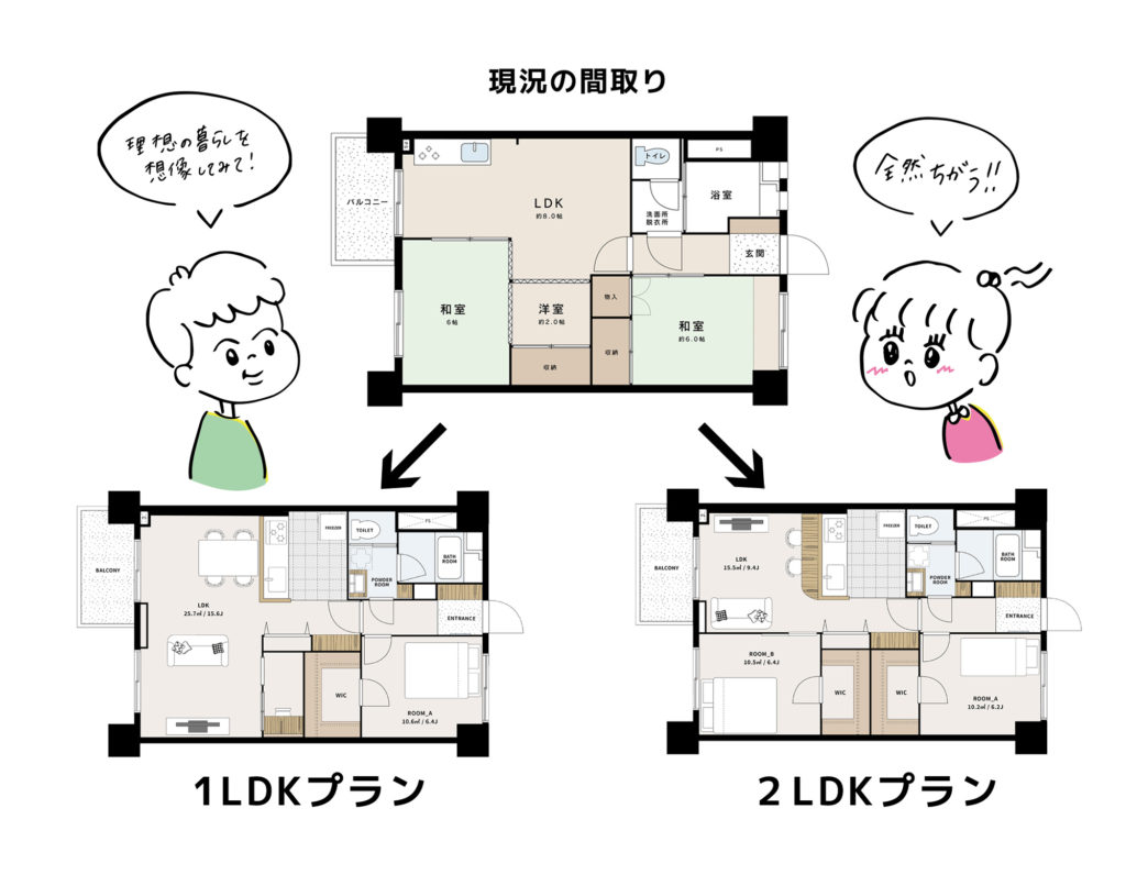 こうすけ君「ここでプロの出番だ!空間デザイナーがフロアプランを提案してくれるんだよ。今日はこの中古物件に最適な2パターンを紹介するよ!」