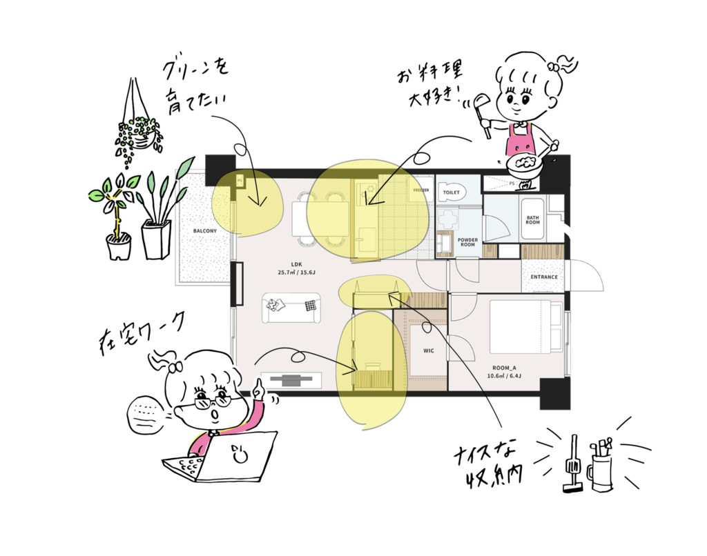 趣味、仕事、家族、収納、映え、持ち物、動線とか、イメージするポイントは色々あるよ。」
