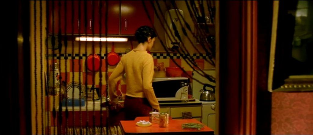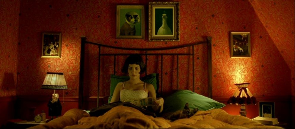 やはり一番魅力的なのが、アメリのアパートメント。ポスターにも使われたアメリのベッドルームは、全方位赤い壁紙が貼られた真っ赤な部屋。といっても少しくすんだ赤で、絵画やクッションなど所々に淡いグリーンが使われているのが好バランスです。真鍮のベッドやスタンドライト、絵画のフレームに主張する色はなく、赤と緑がメインの統一感あるインテリアになっています。