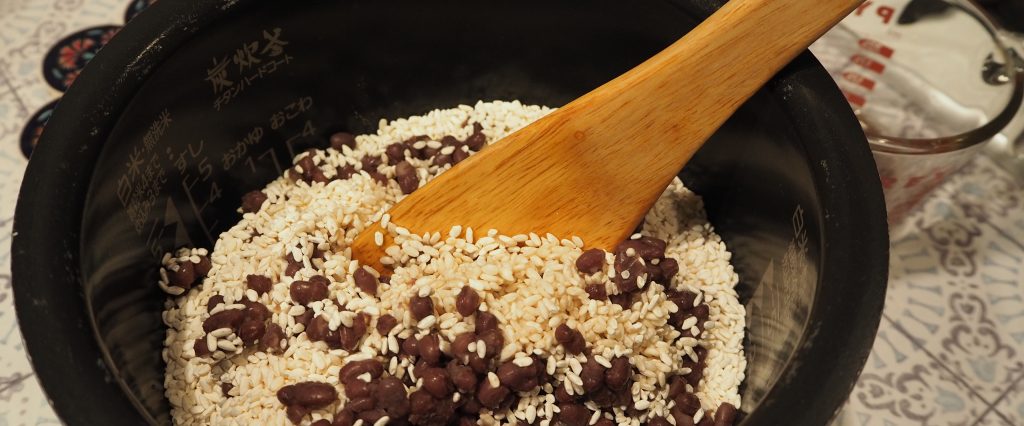 ⑤あずきと米麹、茹で汁を混ぜる:60度程度に冷ましたあずきを炊飯器の釜に移し、そこに米麹を混ぜる。高温のまま米麹を加えるときちんと糖化されず甘くならないので注意。茹で汁約1/2カップも混ぜる。しっとり感が足りなければ茹で汁を足す。