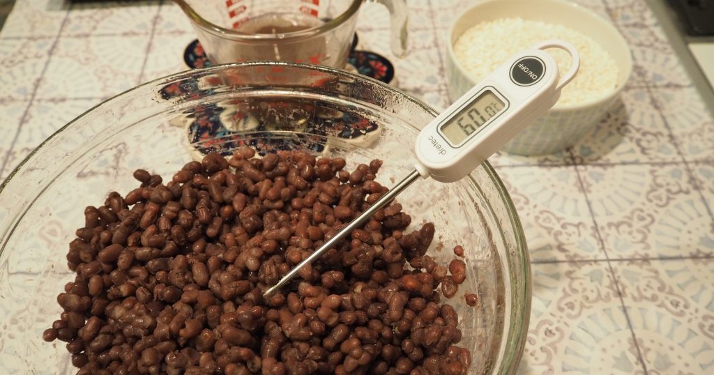 ⑥発酵タイム:あずきの入った釜を炊飯器にセットする。炊飯器のふたは開けたままぬれ布巾を掛け、保温機能で8~10時間保温する。途中で何度かかき混ぜ、布巾をぬらし直す。