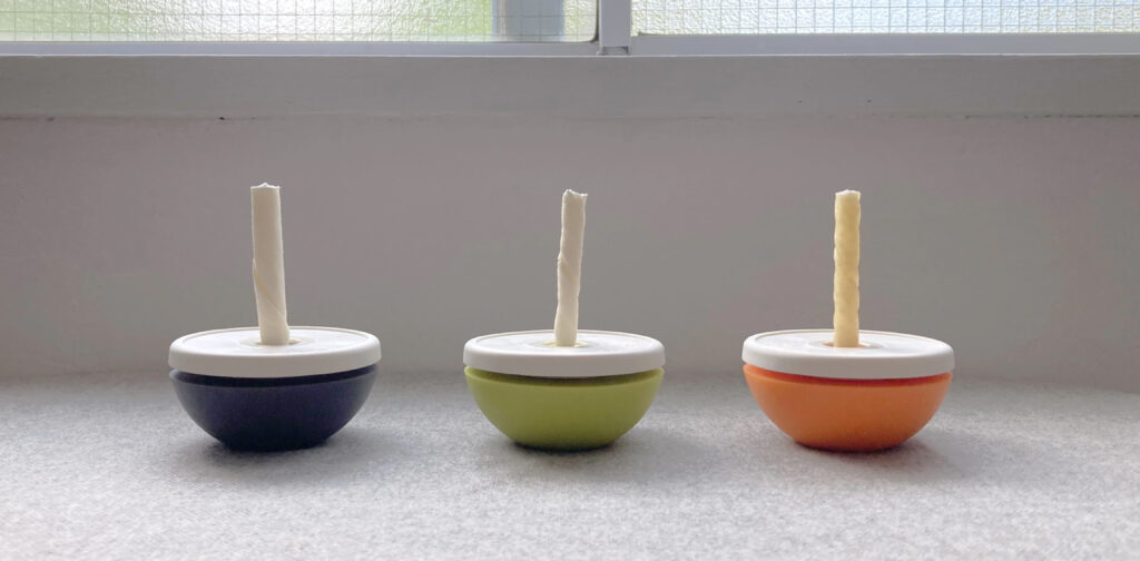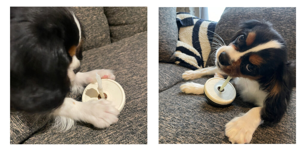歯磨きガムやジャーキーなど細いおやつを挟んで固定できる丸呑み防止ペットグッズ。不安定な形のデザインなので、手で持って一生懸命におやつを食べます。たまに転がるのを追いかけたり、自分で転がしたりと時間をかけて楽しみながらおやつを食べます。