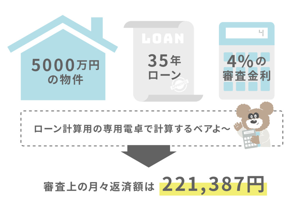 5,000万円の物件を35年ローンで審査金利4%の場合は、審査上の月々返済額は221,387円になるベアよ!