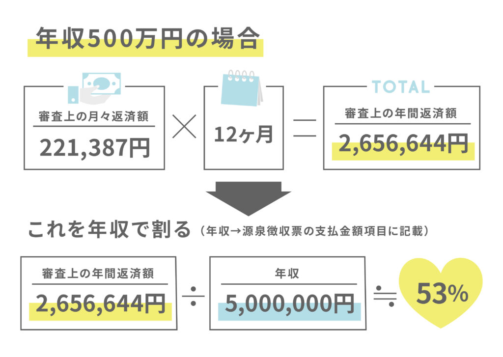 年収500万円の場合は、月々221,387円×12ヶ月=2,656,644円に。これを年収で割る(年収は源泉徴収票の支払い金額項目に記載してあるベア)