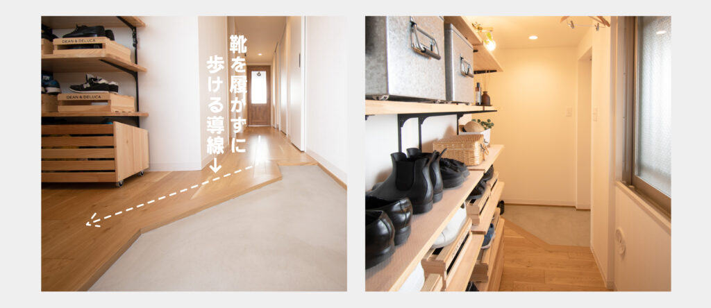 画像のようにフローリングで仕上げ、靴を履かないで行き来できるようにすると、意外と使い勝手がいいベア〜!事例だけで決めず実際に使う場面を想像して!