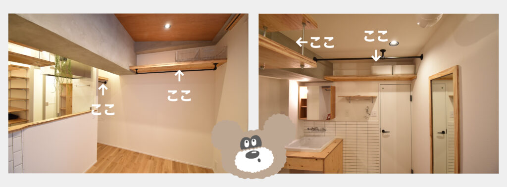 ほら!スペース発見!頭の上に収納を作れる可能性があるベアよ〜!ただし注意点もあるベア!圧迫感が出る可能性もあるので、要注意だベア〜