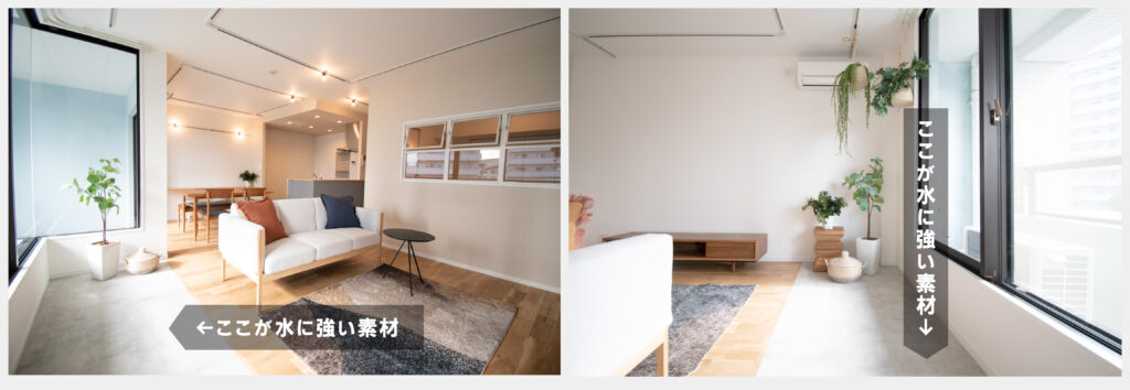 室内で植栽を育てると水がフローリングにかかり、フローリングの劣化の原因になります。そのためベランダで植栽を育てることが多いマンションですが、床材を水に強いものにすれば室内でも安心だベア!